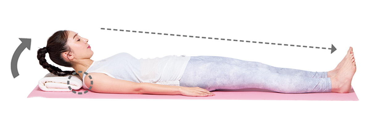 ①リラックスして仰向けに寝る。薄手のバスタオルを畳んで枕にするとやりやすい。