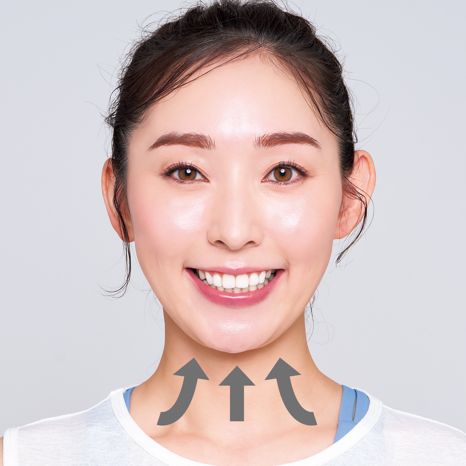 両手の親指を揃えて立て、顎の下にその親指の腹を当てる。下に向けて顎を力いっぱいに引き、親指は顎を押し戻すように力を入れて5秒間キープ。これを5~10回行う。
