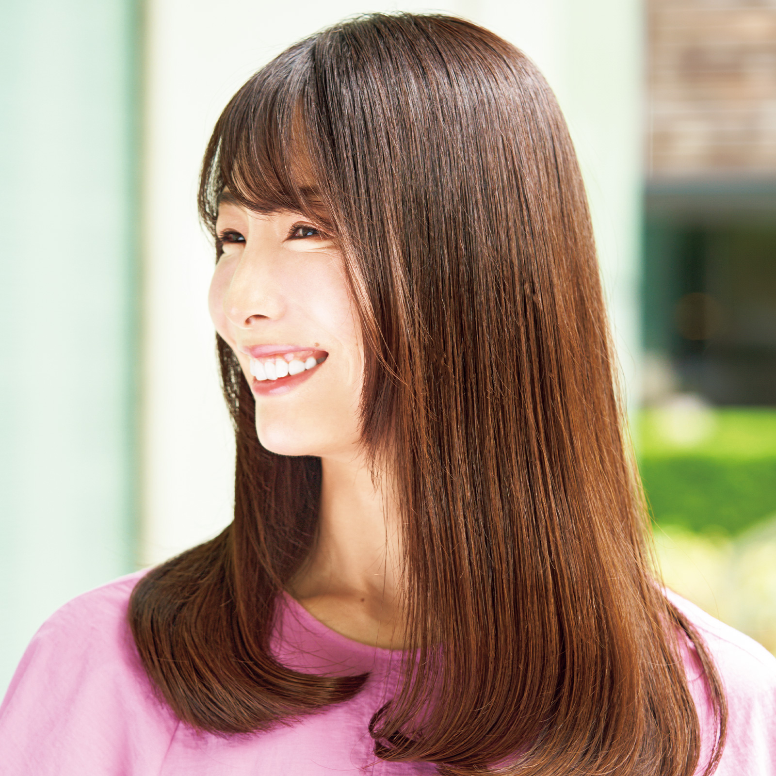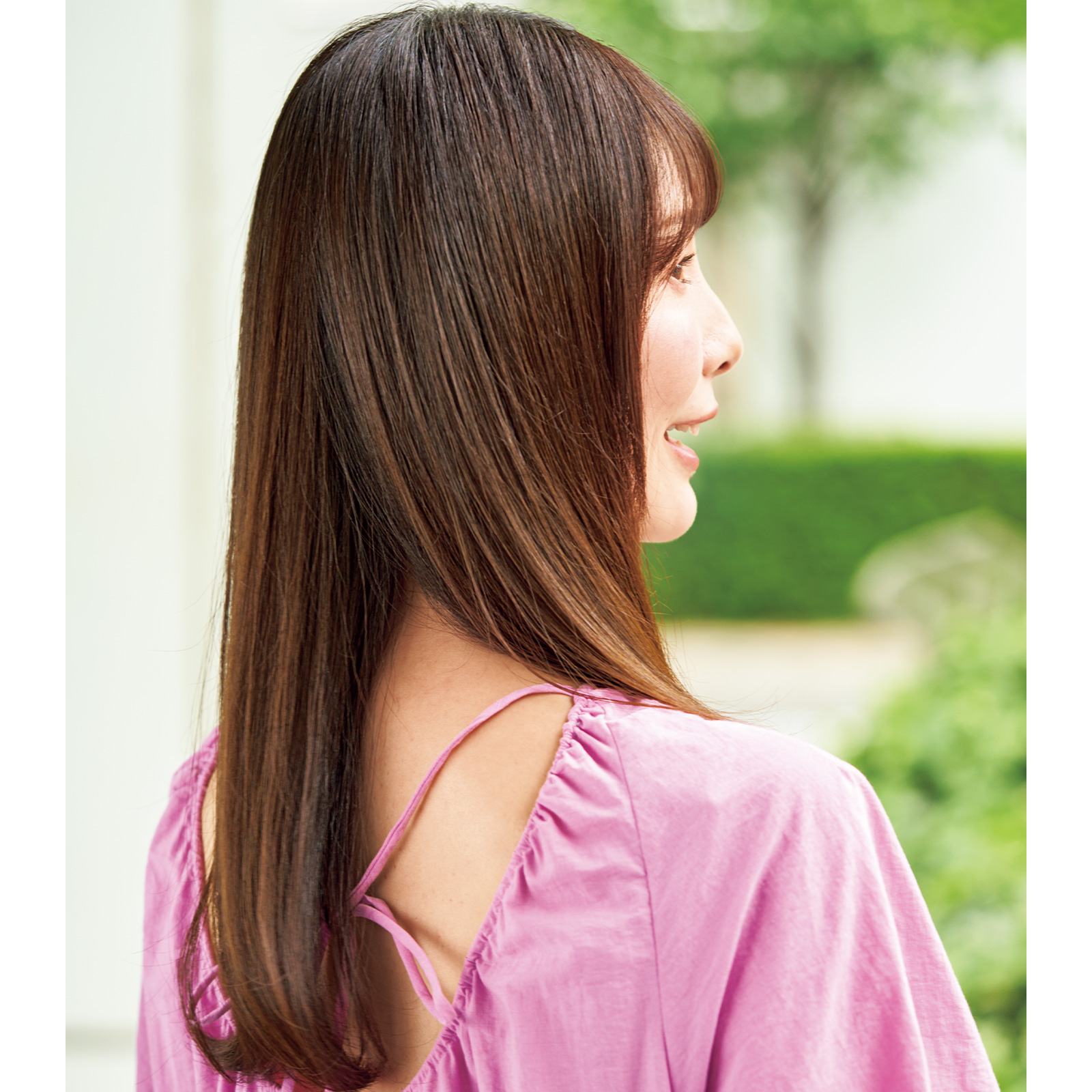 うねりやぼさつき、ツヤのなさなどのエイジング毛は、梅雨や夏の湿気で膨らんでパサつきがち。今どきの地毛風ストレートで髪を扱いやすく、さらに湿気であっという間にアイロン巻きが取れてしまう悩みも一度で解消を。(浅沼さん)