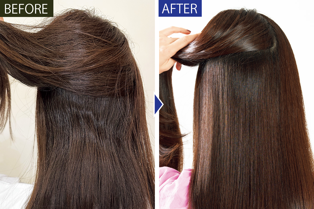 トップから毛先以外はストレートパーマで湿気を吸っても膨らまない、サラサラヘアに整えます。ピンピン飛び出る白髪や、パサついて見えるアホ毛も目立たずになじみます。