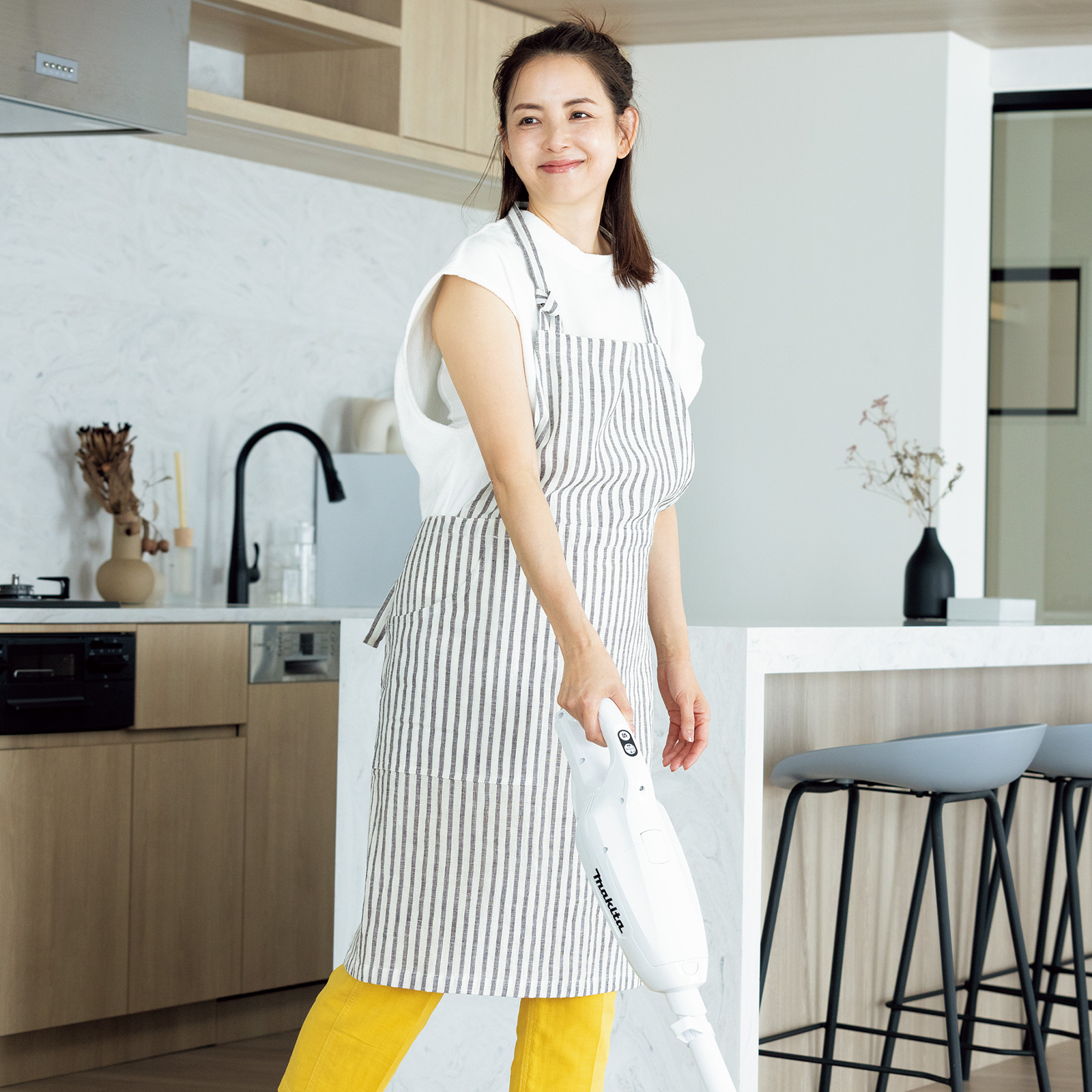 Tシャツ¥9,900(シングファブリックス/シング)パンツ¥9,900(ユニバーサルオーバーオール×ジーンズファクトリー/ジーンズファクトリー 卸団地本店)パーカ¥18,700(ダブルスタンダードクロージング/フィルム)エプロン(スタイリスト私物)