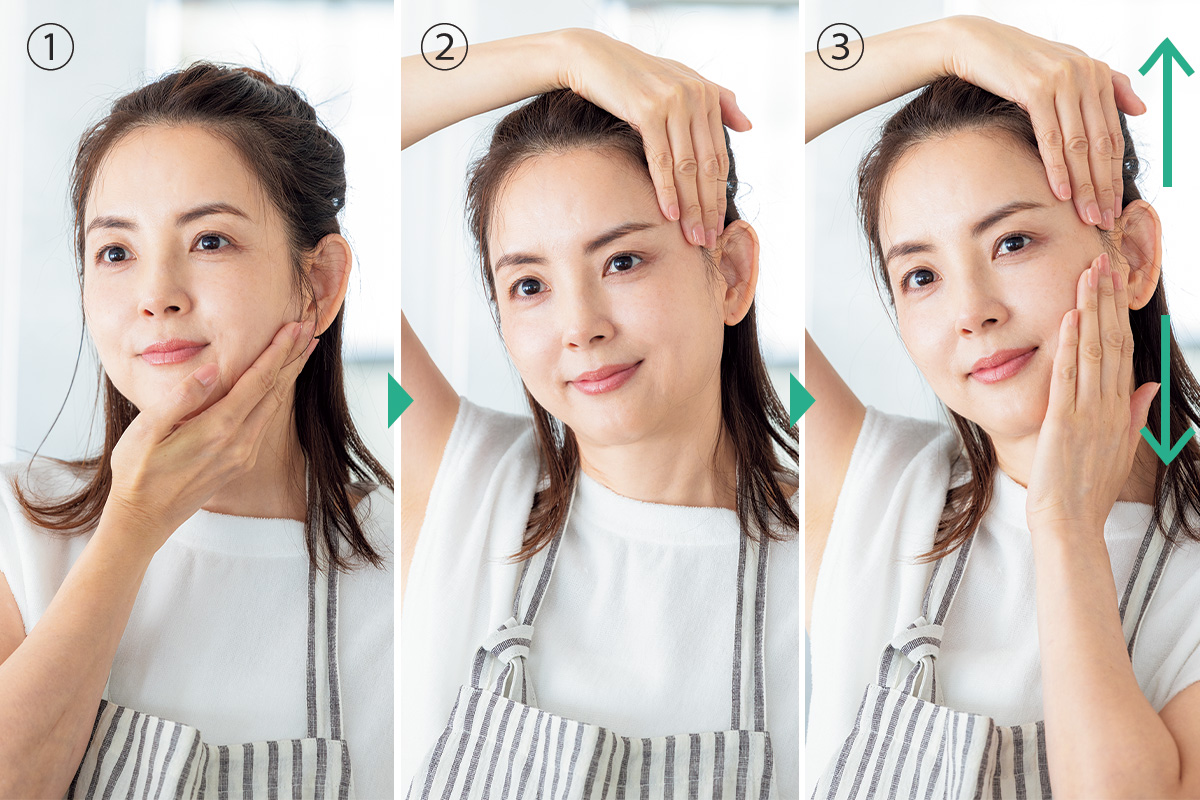 手を反対側のアゴ下に当て、肌を押さえながらその手をこめかみまで持ち上げる。もう片方の手で引っ張り上げた肌を下に引っ張り10秒間キープ。立毛筋(鳥肌が立つ時に毛を逆立てさせる筋肉)を刺激することで顔のリフトアップ効果が期待できる。