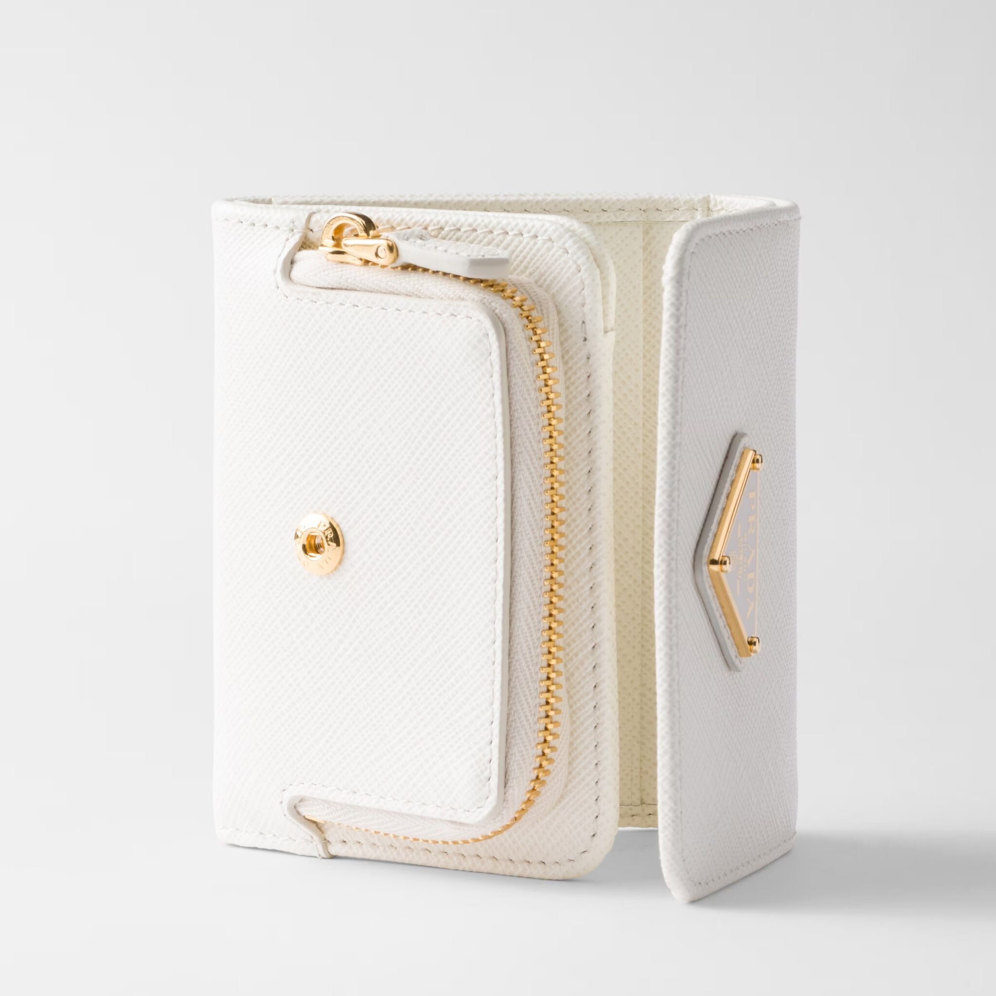 エレガントな「サフィアーノ」レザー(牛革)素材の財布。キリリとしたホワイトにゴールドがマッチ。[ヨコ9.5×タテ8cm、カードホルダー4、ジップ付きコインポケット1、札入れ1、内ポケット1]財布¥102,300*予定価格(プラダ/プラダ クライアントサービス)