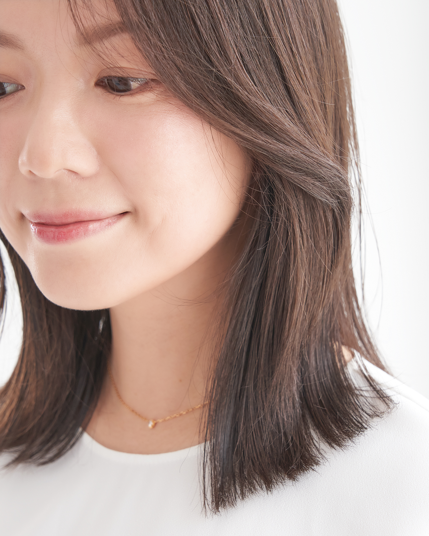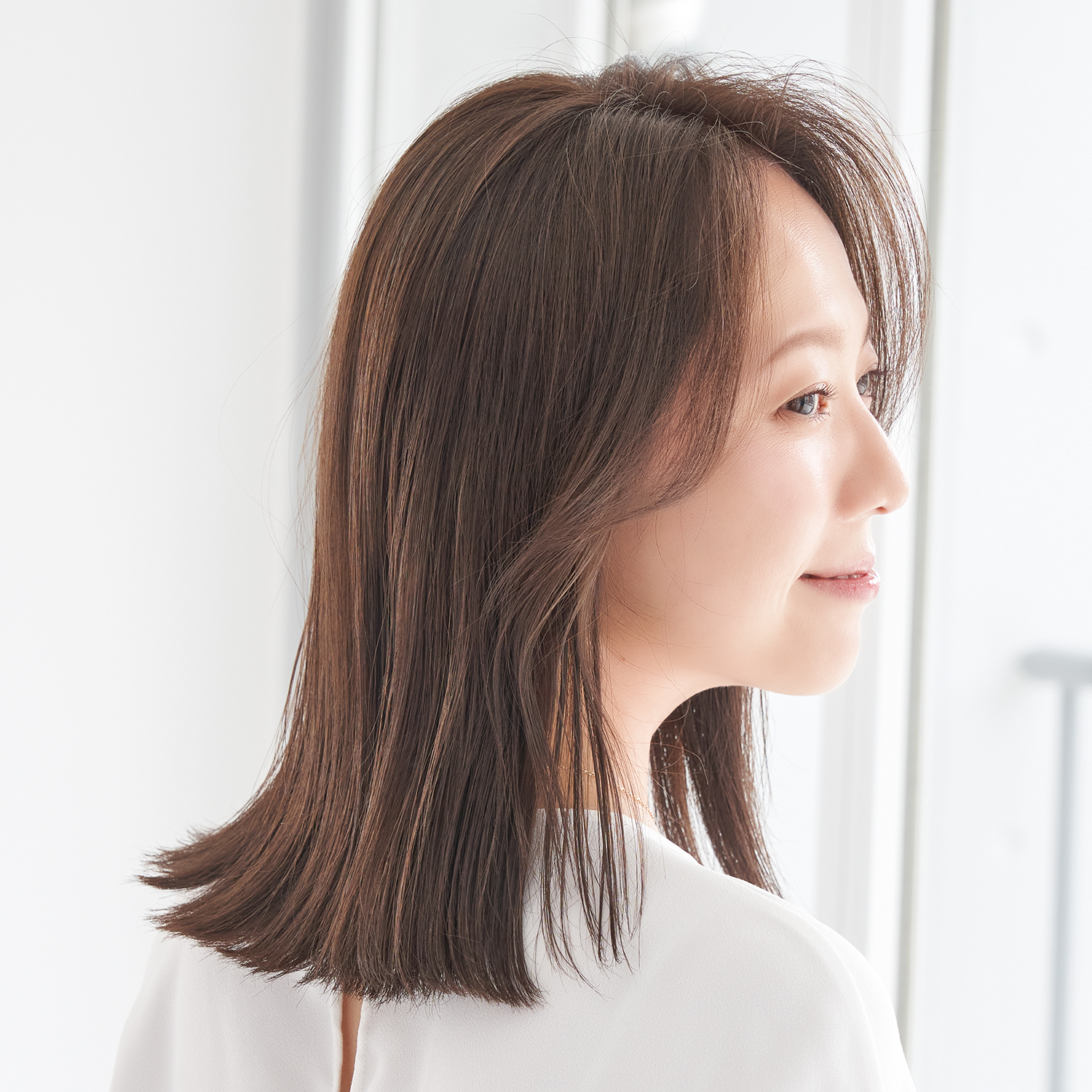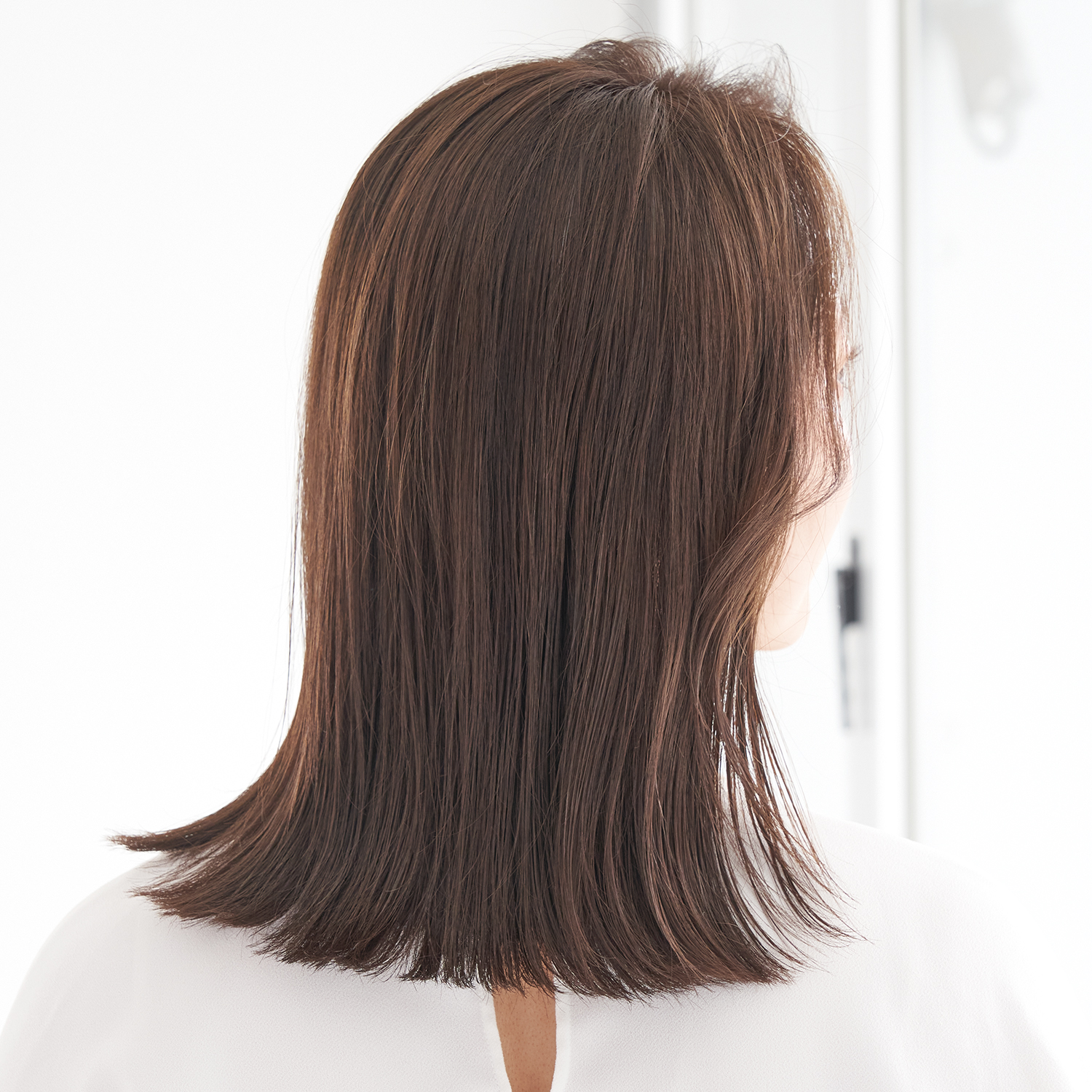 顔周りはリバースになるようにレイヤーを入れ、毛先はカーテンをまとめるタッセルのようなストレートラインにカット。トップはふんわり、ボトムスはストレートなラインの対比がペタンコ見え回避を約束。