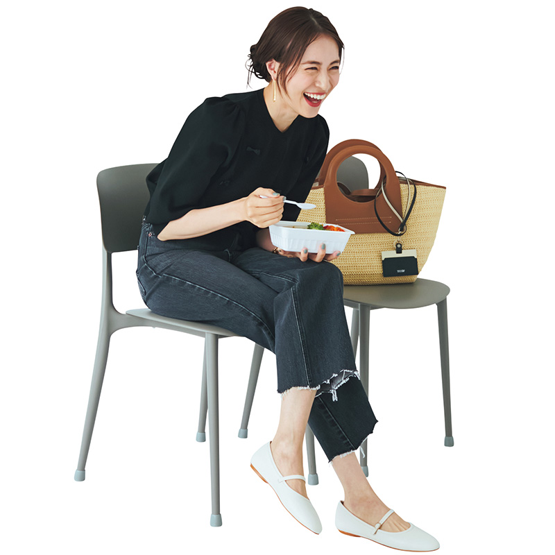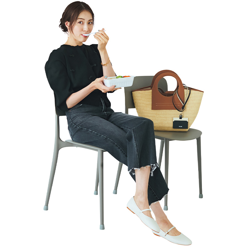 カーディガン¥24,200(エムマーリエ ル カセット/フランドルカスタマーサービス)デニムパンツ[6月中旬展開予定]¥9,460(ミラ オーウェン/ミラ オーウェン ルミネ新宿2店)ピアス¥12,100(ワンエーアールバイウノアエレ/ウノアエレ ジャパン)ブレスレット¥7,700(ソーク/アンソロジー)バッグ¥90,200(ヘリュー/ショールーム セッション)カードホルダー¥16,500(ラルコバレーノ/エンメ)バレエシューズ¥40,700(ファビオ ルスコーニ/ファビオ ルスコーニルミネ有楽町店)