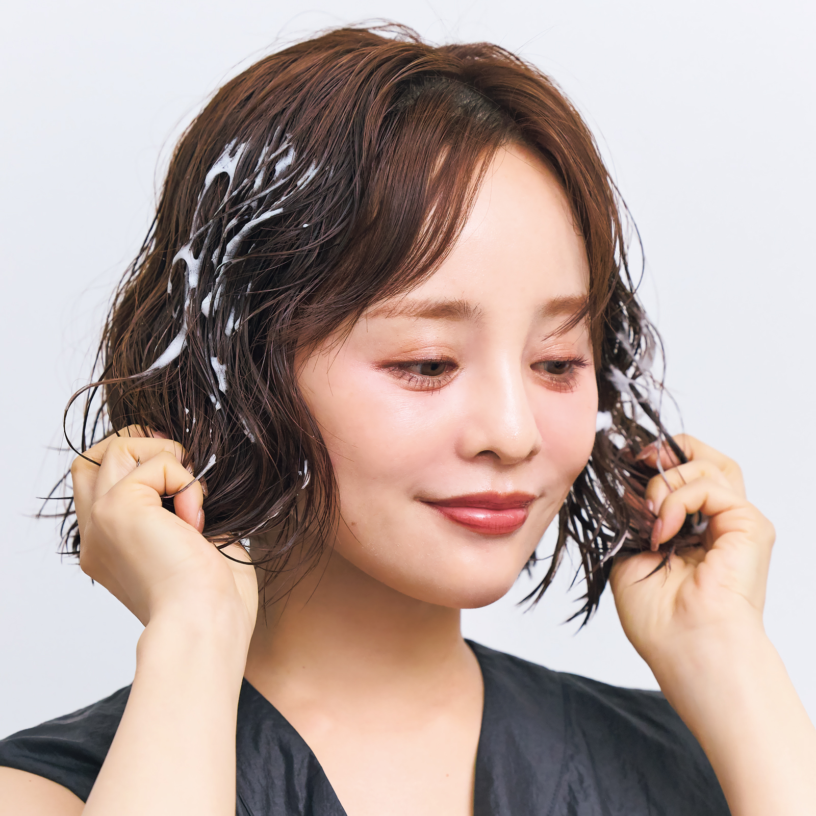 ①濡れている髪全体にフォームをもみ込みます。クセが伸びないように、つかみ上げるようにつけるのがポイント。