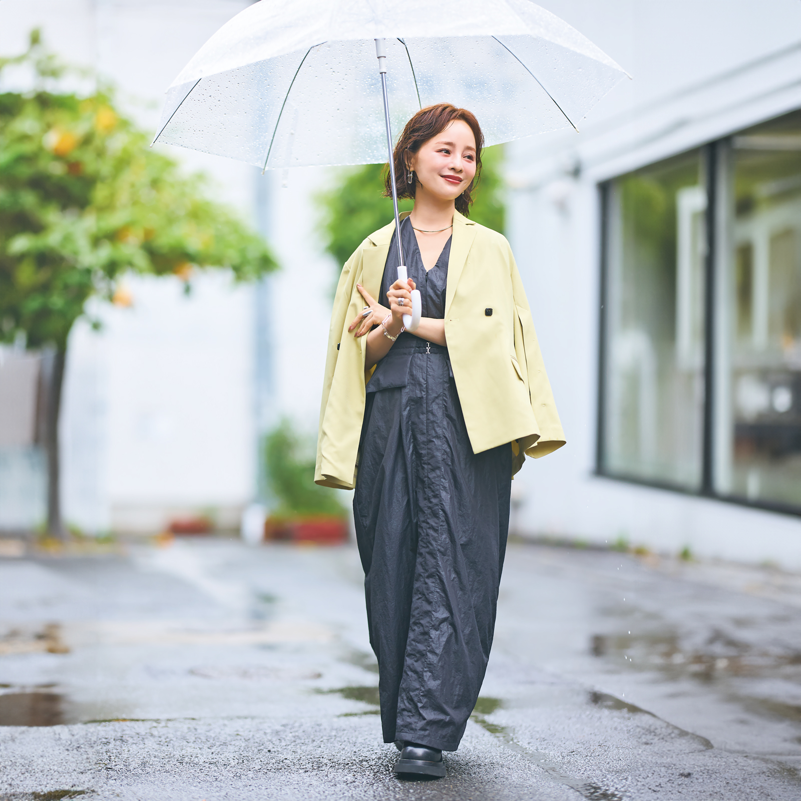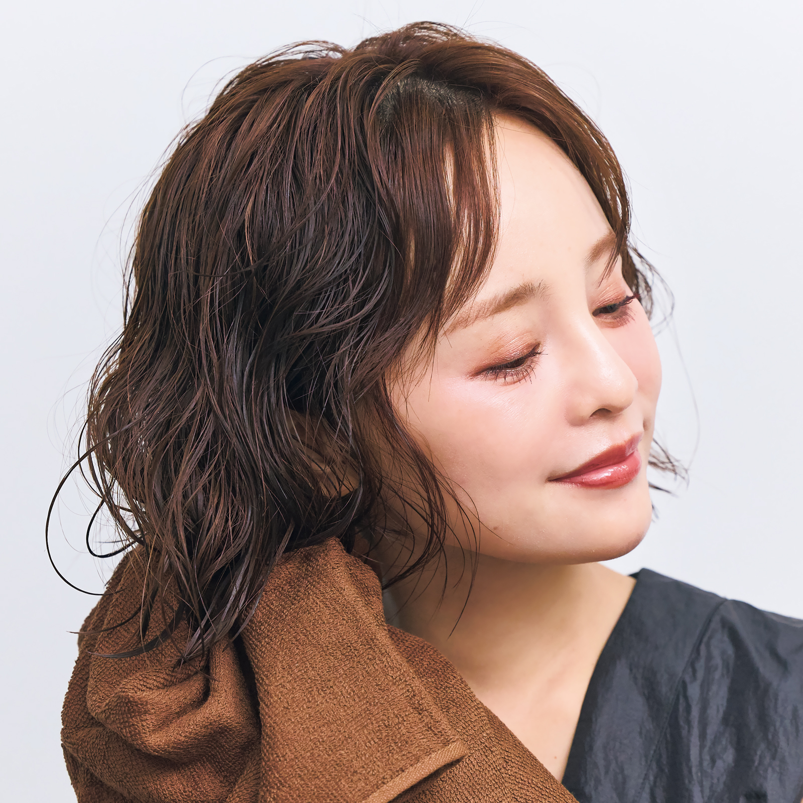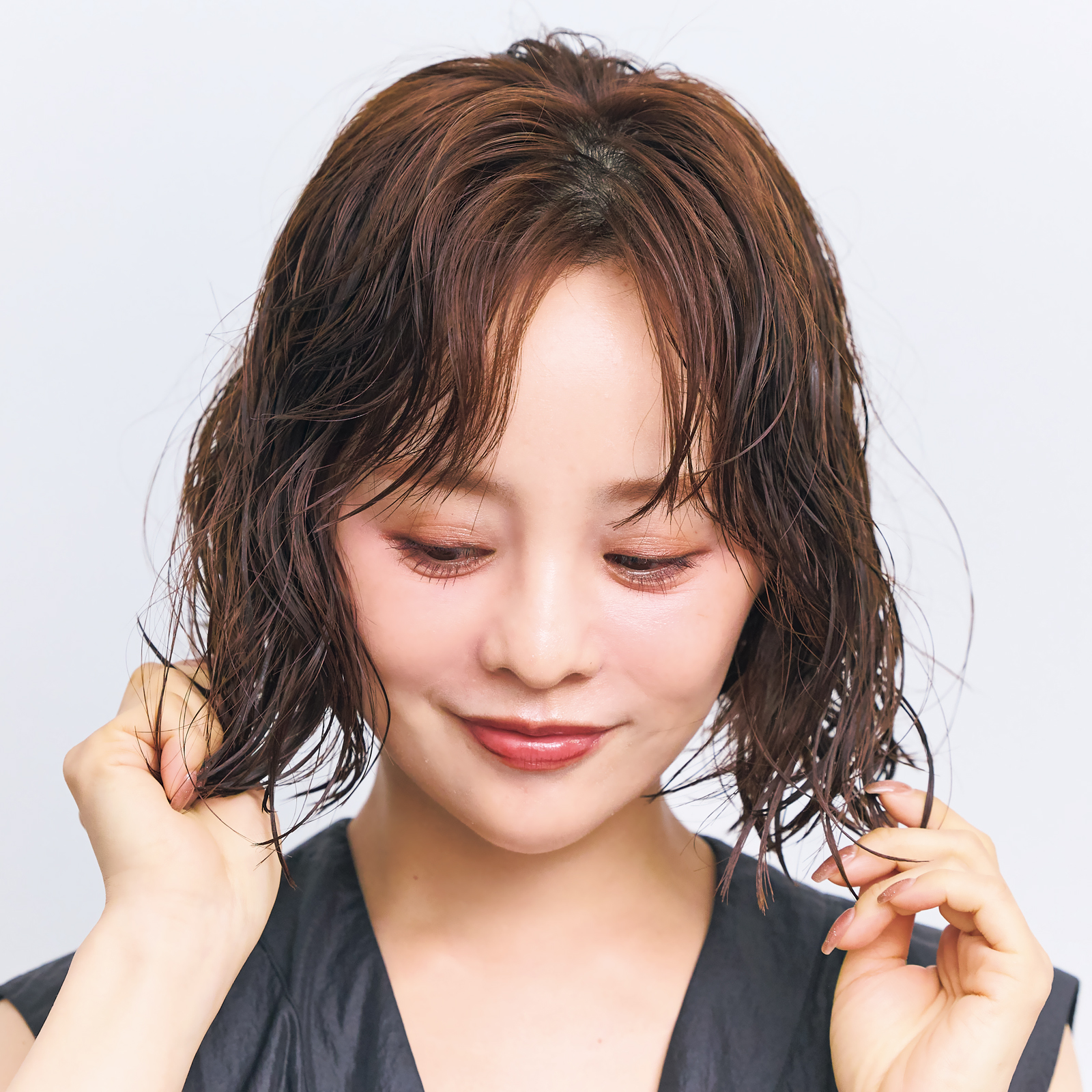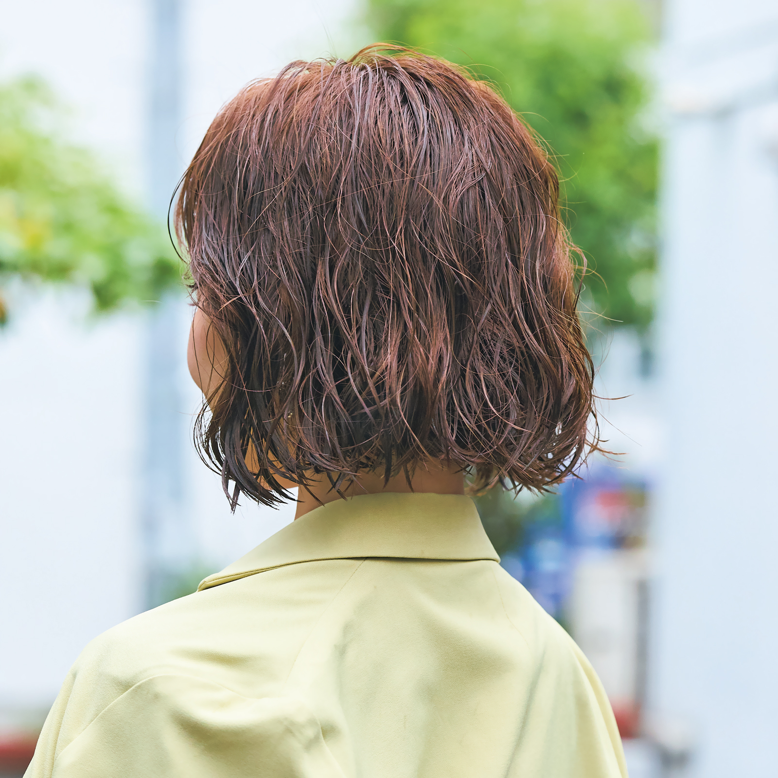 「梅雨に最適、クセを生かしたパーマ風ヘア。クセは出ても広がらないように全体にフォーム、毛先にクリームをつけるのがコツです。」