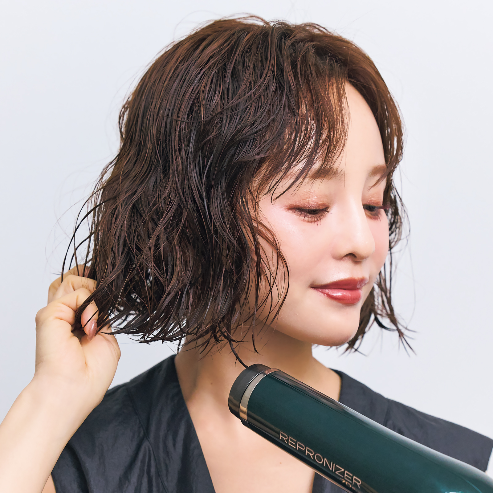 ③厚みのある衿足の髪だけドライヤーで乾かします。毛先が広がらないように手で押さえながら弱めの風量でドライ。