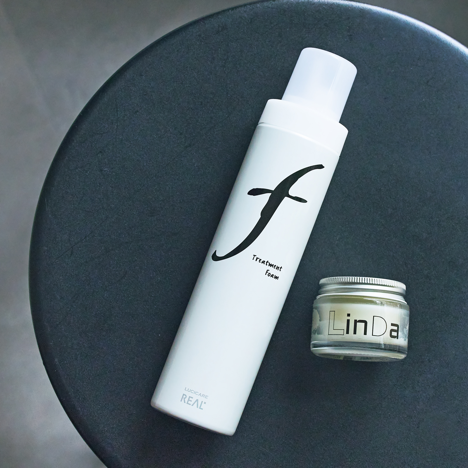 〈左から〉濡れた髪にもみ込むルシケア トリートメント フォームFと毛先につけるリンダボタニカルクリーム。(ともに私物)