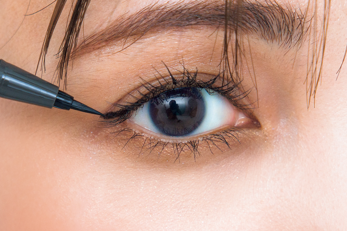 目尻にのみ短め&太めの跳ね上げを引くことでさり気なく、洒落感のある眼差しを演出。1点集中でも映えるから、他のラインは引き算でOK。