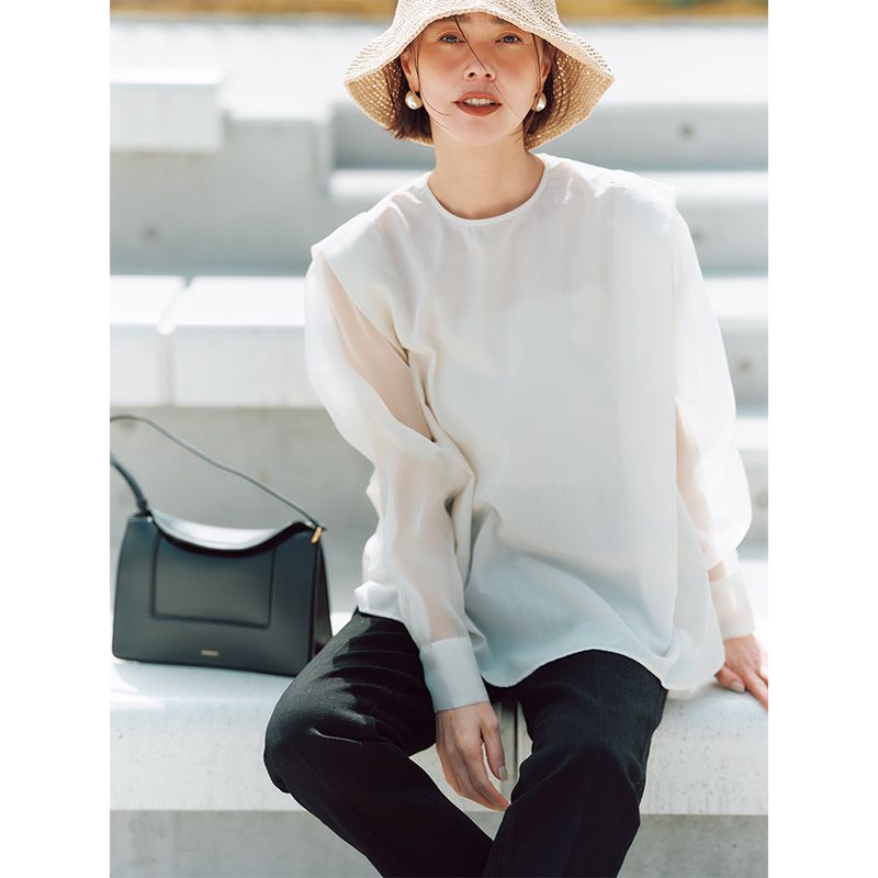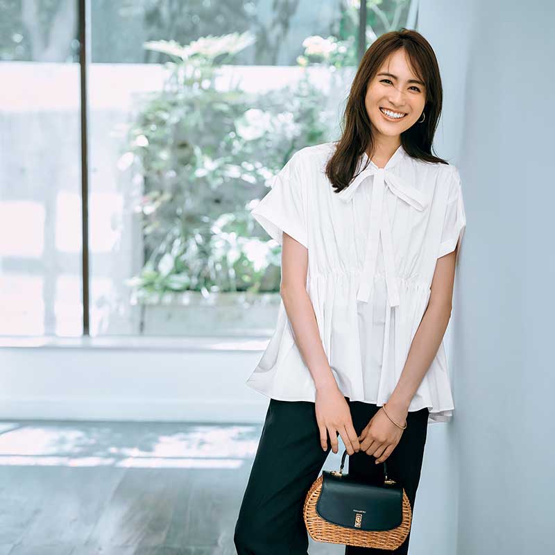 ブラウス¥14,300(アレグレ)パンツ¥31,900(ブランベール/ウールン商会)バッグ¥25,300(ヴィオラドーロ/ピーチ)ピアス¥58,300〈モニス〉バングル¥6,330〈エイチアッシュ〉(ともにフォーティーンショールーム)/[サックス]ブラウス¥14,300(アレグレ)パンツ¥46,200(ATON/エイトン青山)イヤリング¥12,600(アビステ)バッグ¥14,850(ダイアナ/ダイアナ銀座本店)
