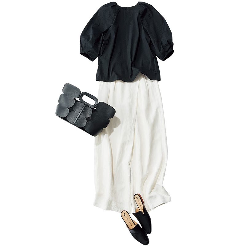 ブラウス¥8,990(プラステ)パンツ¥23,980(ネイヴ/ネイヴ〈オンワード樫山〉)バッグ¥69,300(ペリーコ/アマン)シューズ¥34,100(ファビオ ルスコーニ/ファビオ ルスコーニ ルミネ有楽町店)