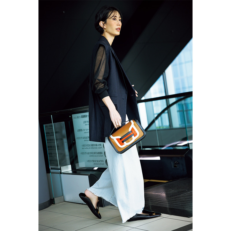 カーブデニムパンツ¥23,100(ケラウズランブラ/ジャック・オブ・オール・トレーズ プレスルーム)濃紺ジレ¥42,900(プルミエ アロンディスモン)シアートップス¥35,200(デパリエ/デパリエ 伊勢丹新宿店)ピアス¥121,000(ウノアエレ/ウノアエレ ジャパン)バッグ¥170,500(ピエール アルディ/ピエール アルディ 東京)靴¥122,100(セルジオ ロッシ/セルジオ ロッシ カスタマーサービス)