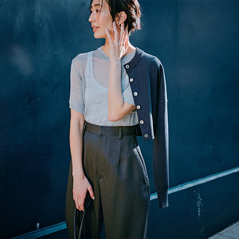 トップス¥30,800〈エイチビューティ&ユース〉パンツ¥36,300〈ロエフ〉(ともにエイチ ビューティ&ユース)タンクトップ¥5,500(バナナ・リパブリック)カーディガン¥28,600(ナゴンスタンス)