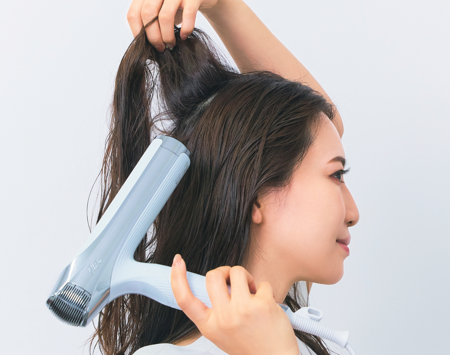 根元が立ち上がるように、手グシを上に向けて通しながら風を下から当てます。手グシを何度も通し、空気を含ませて。