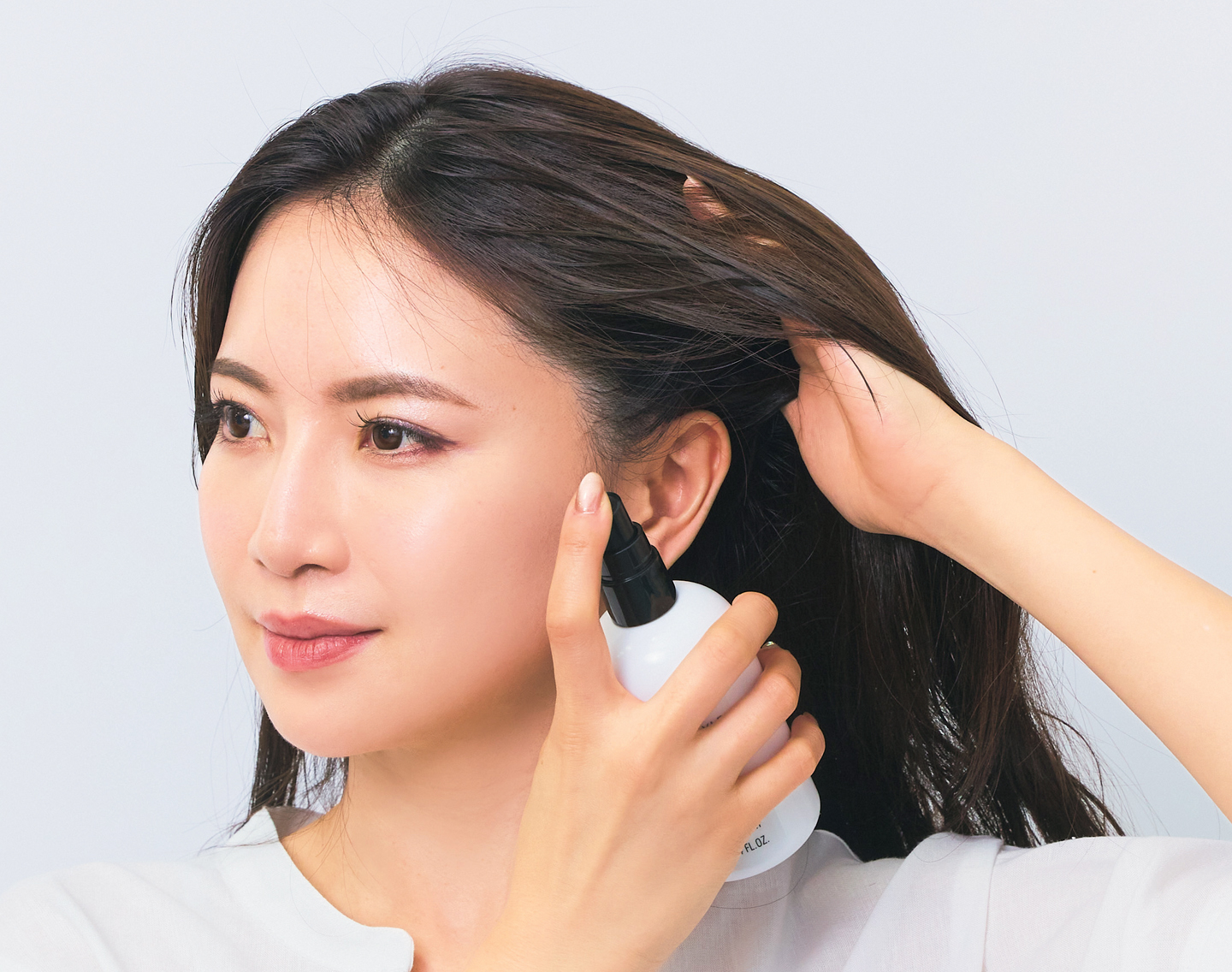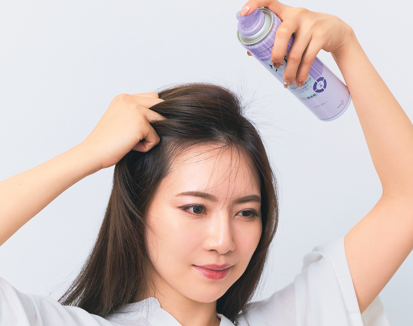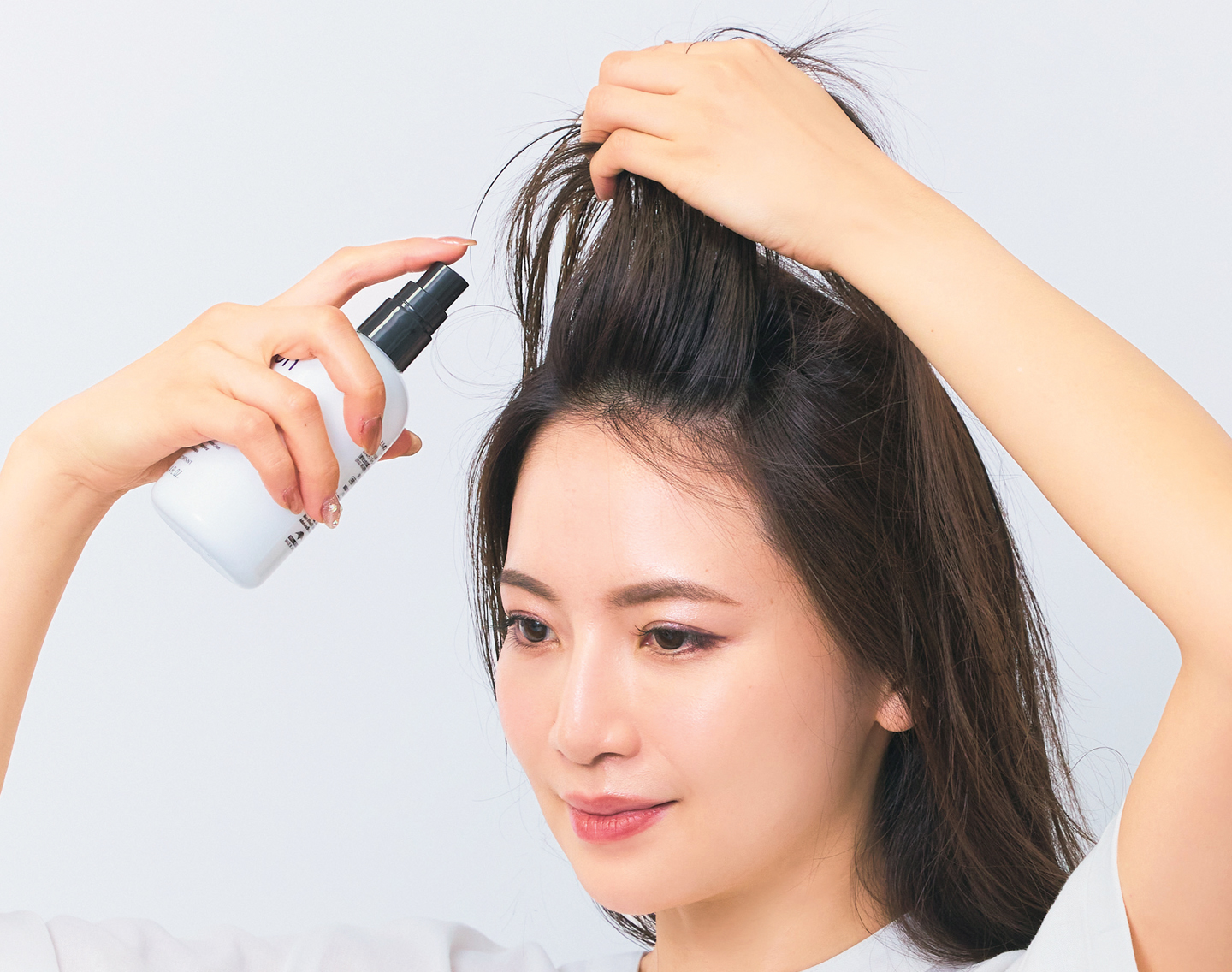 トップにもミストを。根元が立ち上がるように髪を持ち上げ、根元に吹きかけます。後頭部付近にも吹きかけるのがコツ。