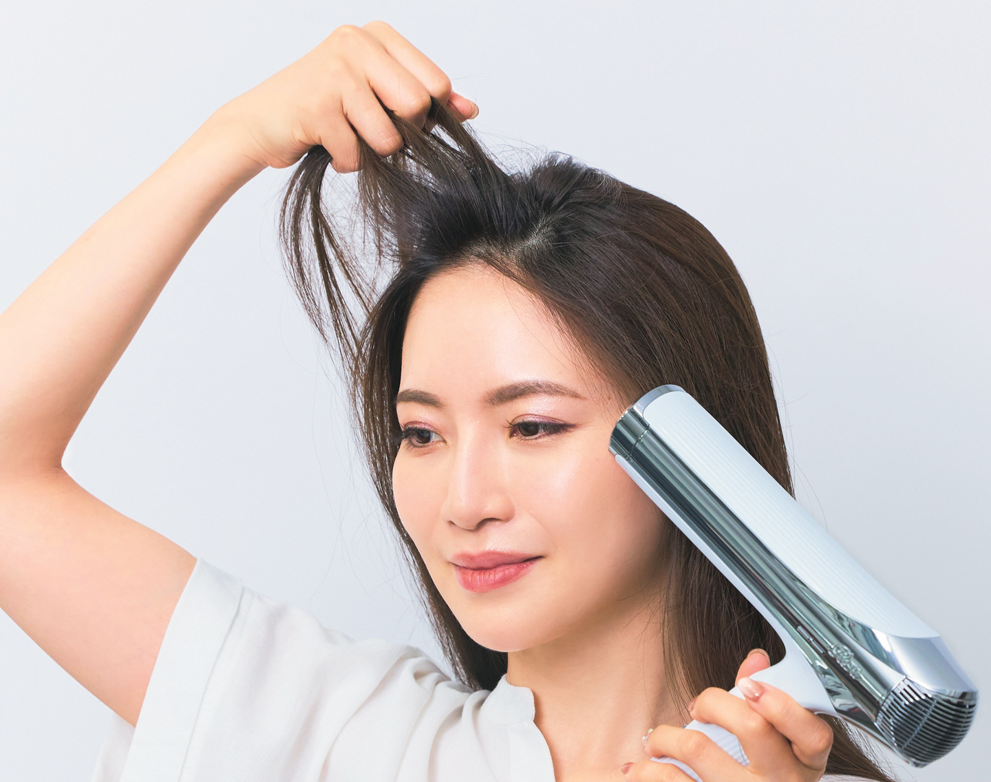 トップの根元が立ち上がるように引き出し、下から風を当てて乾かします。仕上げは根元に冷風を当てて、毛流れを固定して。