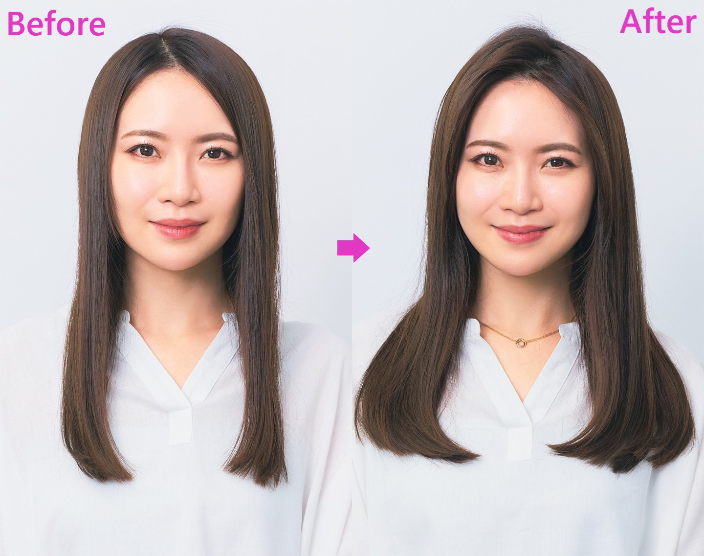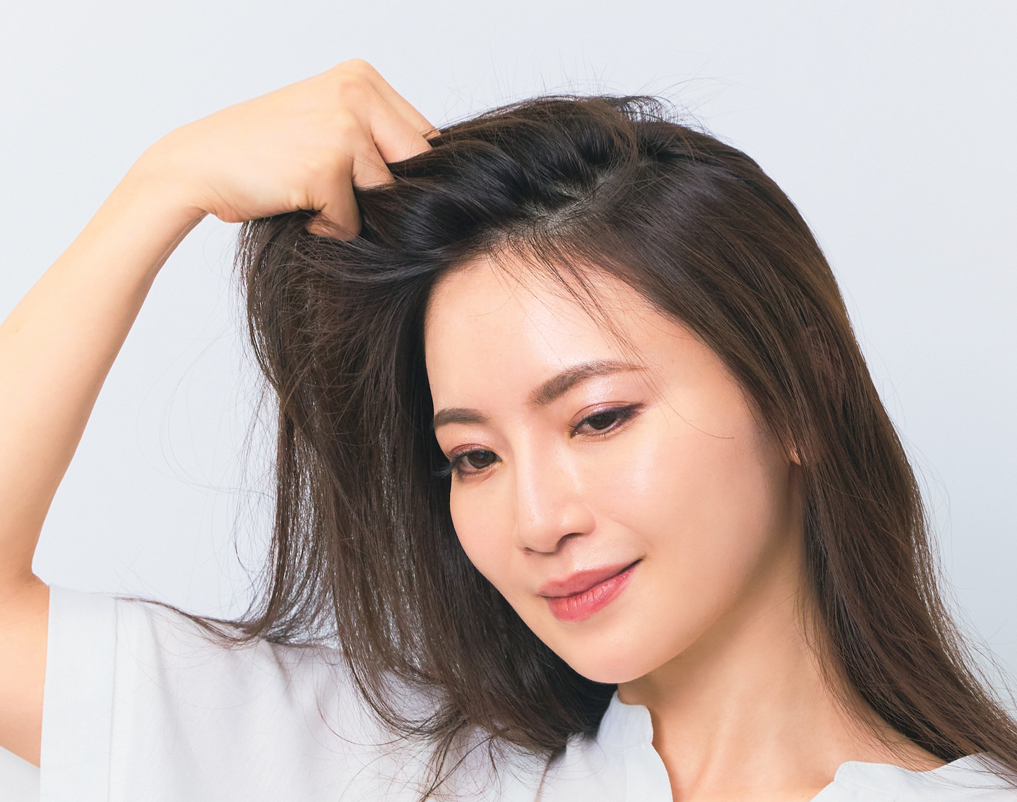 トップの根元が立ち上がるようにドライし、普段の毛流れと逆に分け目を作ったのがポイント。ふんわりとした高さが出て、若々しく。