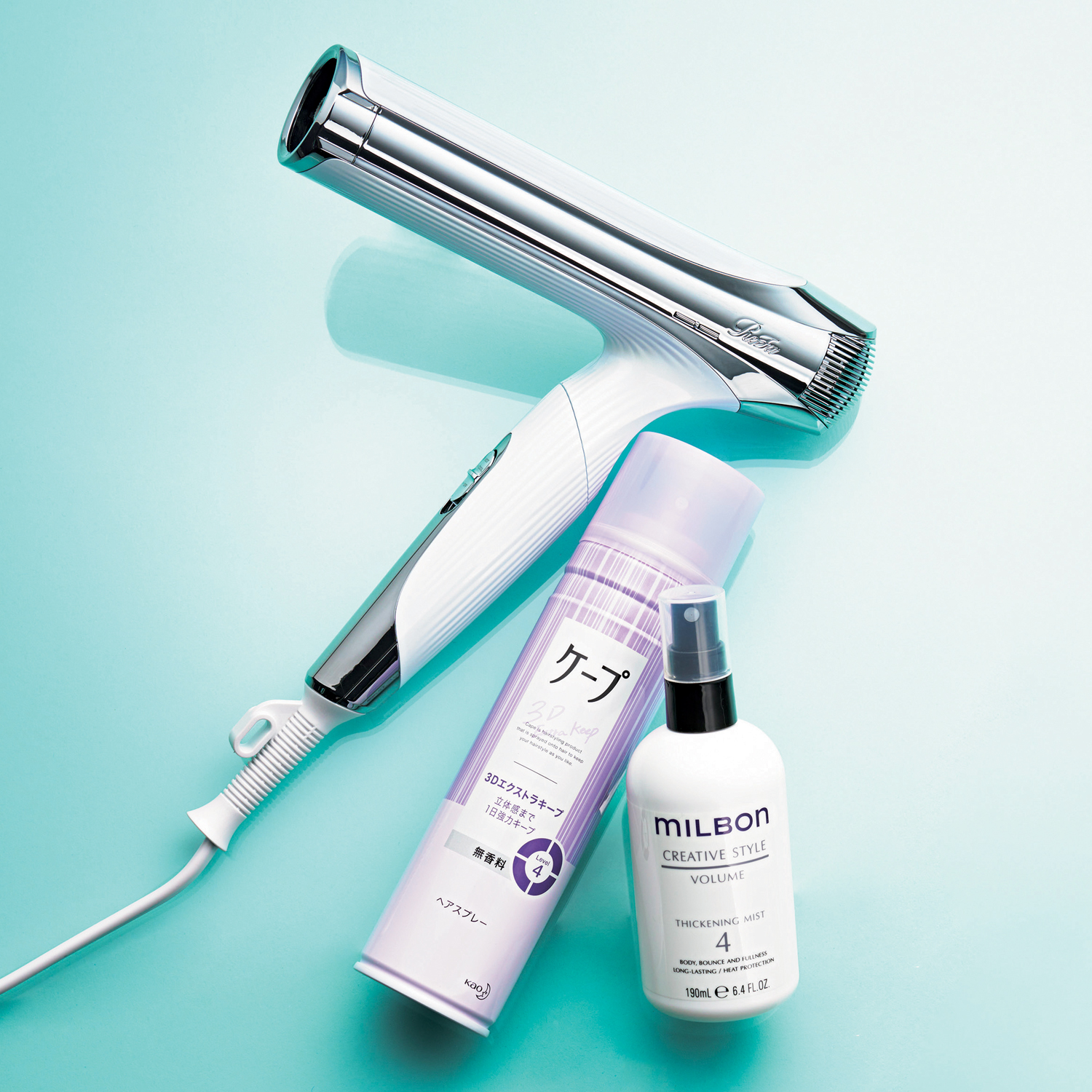 中:耐湿キープ処方が立体感を一日中保つ。ケープ 3D エクストラキープ 無香料 180g ¥731〈編集部調べ〉(花王)右:根元にボリュームが出せるミスト。ミルボン シックニング ミスト4 190ml¥2,200〈美容室専売品〉(ミルボン)