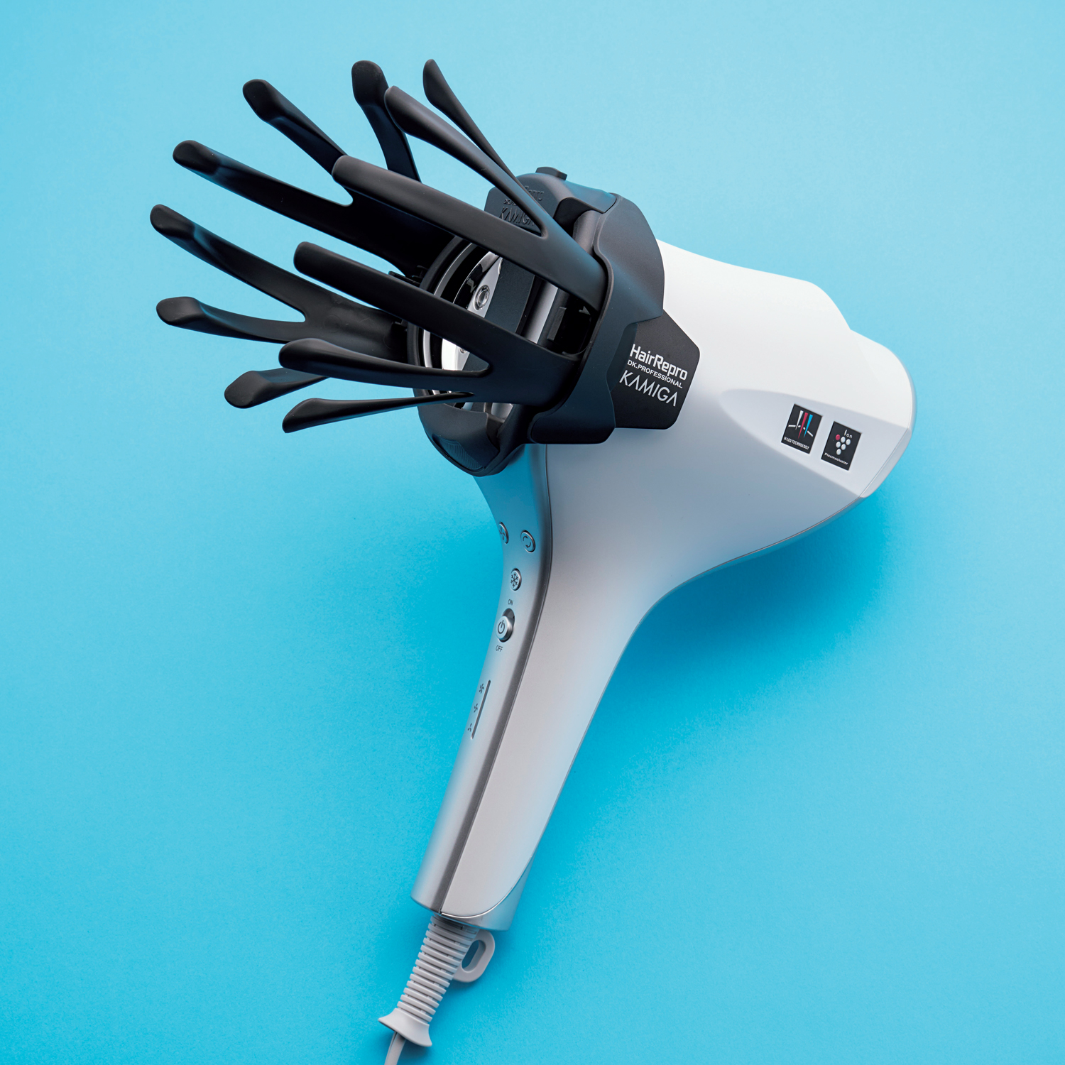 髪と頭皮にアプローチする波長630nm の赤色LED「N-LED beam」と青色LEDを搭載。指の形を模したアタッチメントのカミガハンドが、頭皮に心地よい刺激を与えます。N-LED Sonic KAMIGA ホワイト 美髪&スカルプケアドライヤー¥47,300(アデランス)