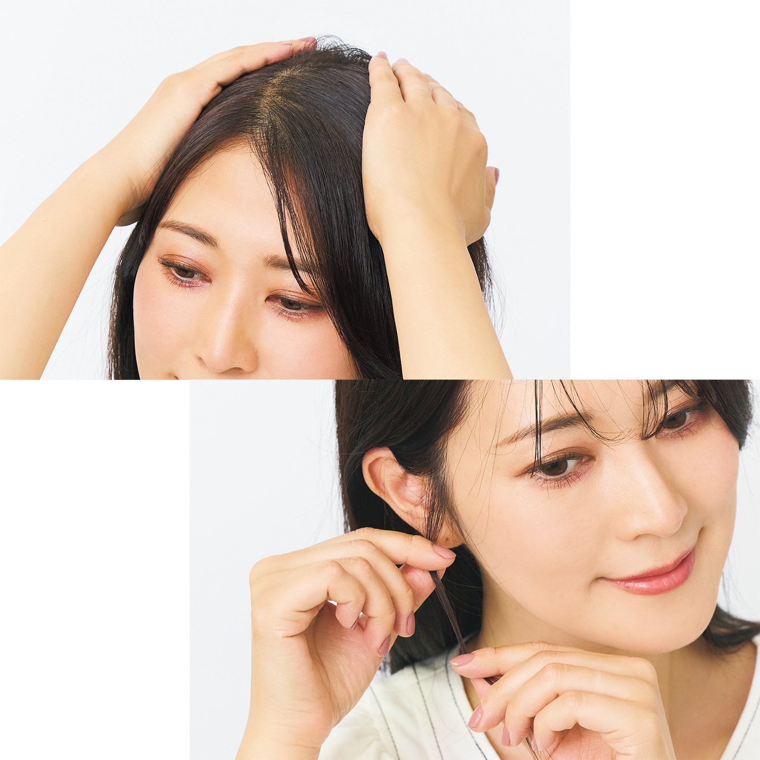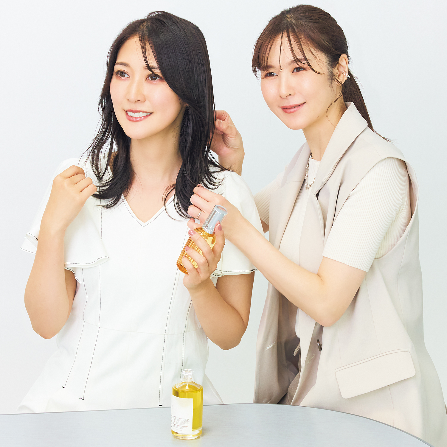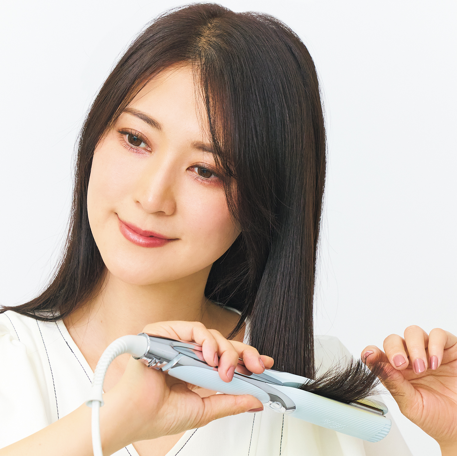髪が少ない肩上ボブで1~2プッシュ、髪が多い肩上ボブで4~5プッシュが目安。つけすぎはベタッとする原因なので、1プッシュずつなじませていくのがコツです。おくれ毛やアホ毛は手に残ったオイルで充分。アイロンはサッと通す程度で大丈夫!