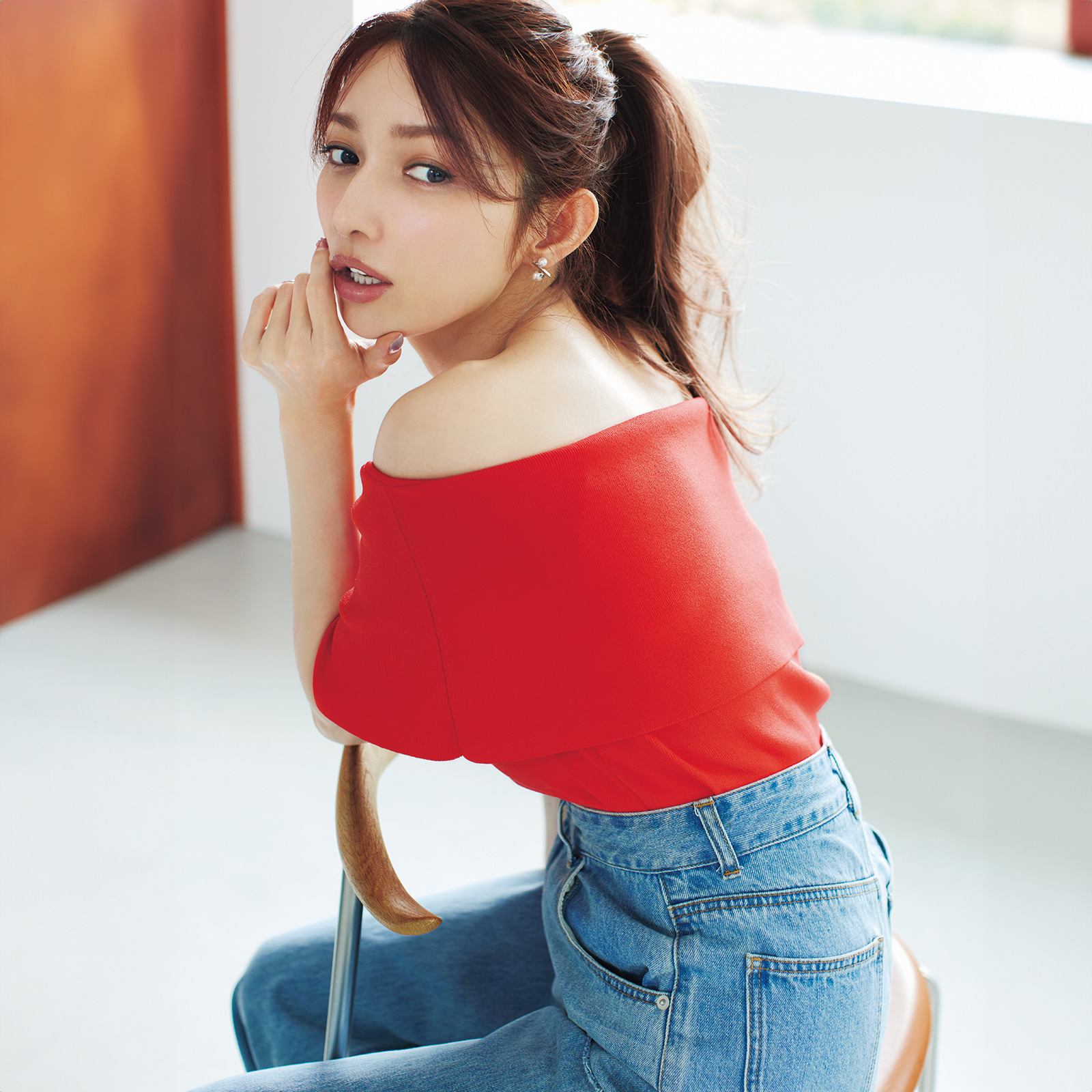 ニット¥22,000(ソブ/フィルム)デニム¥19,800〈カデュネ〉ピアス¥3,740〈クロノス〉(ともにロードス)