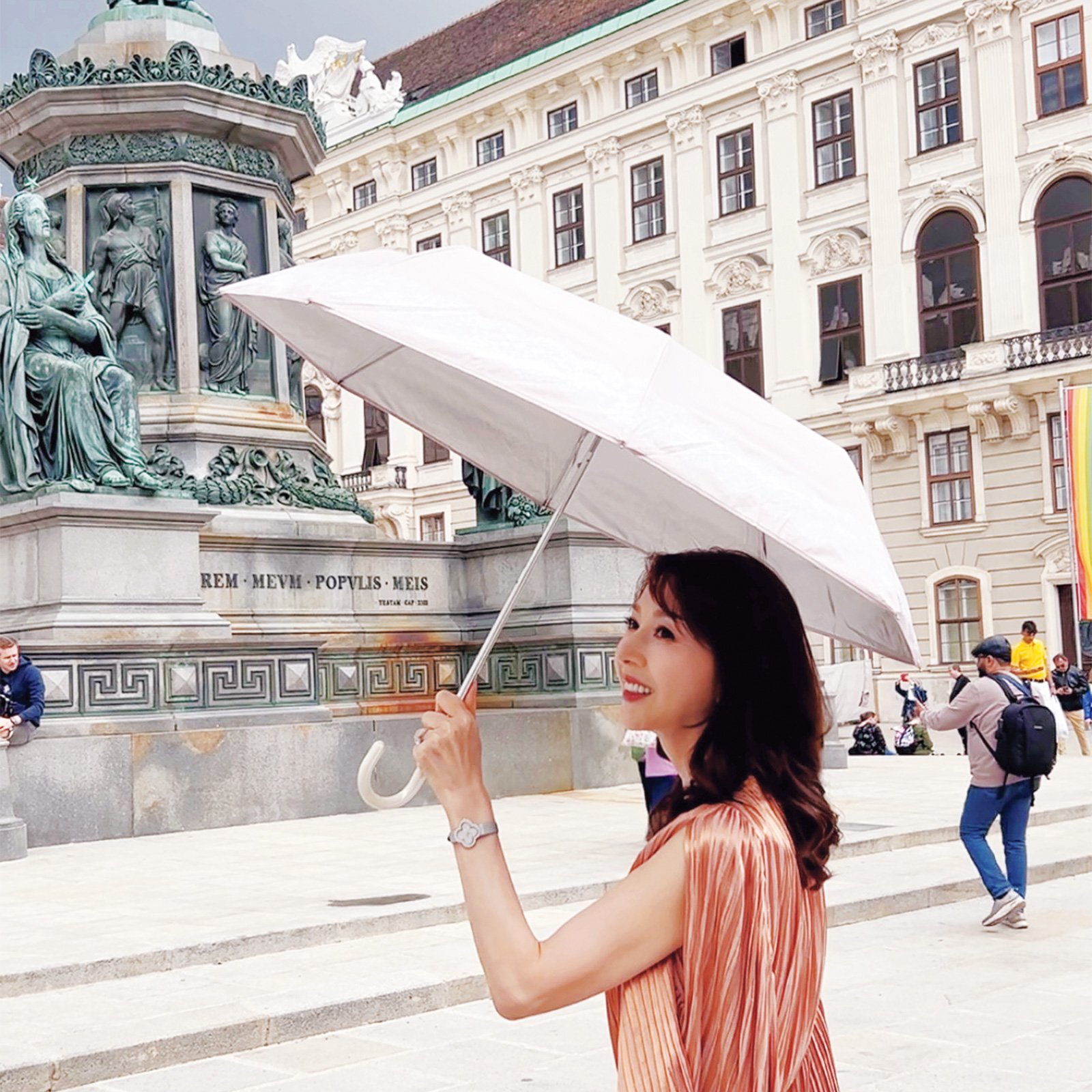 ヨーロッパの街中でも折りたたみ式の日傘は欠かせません。