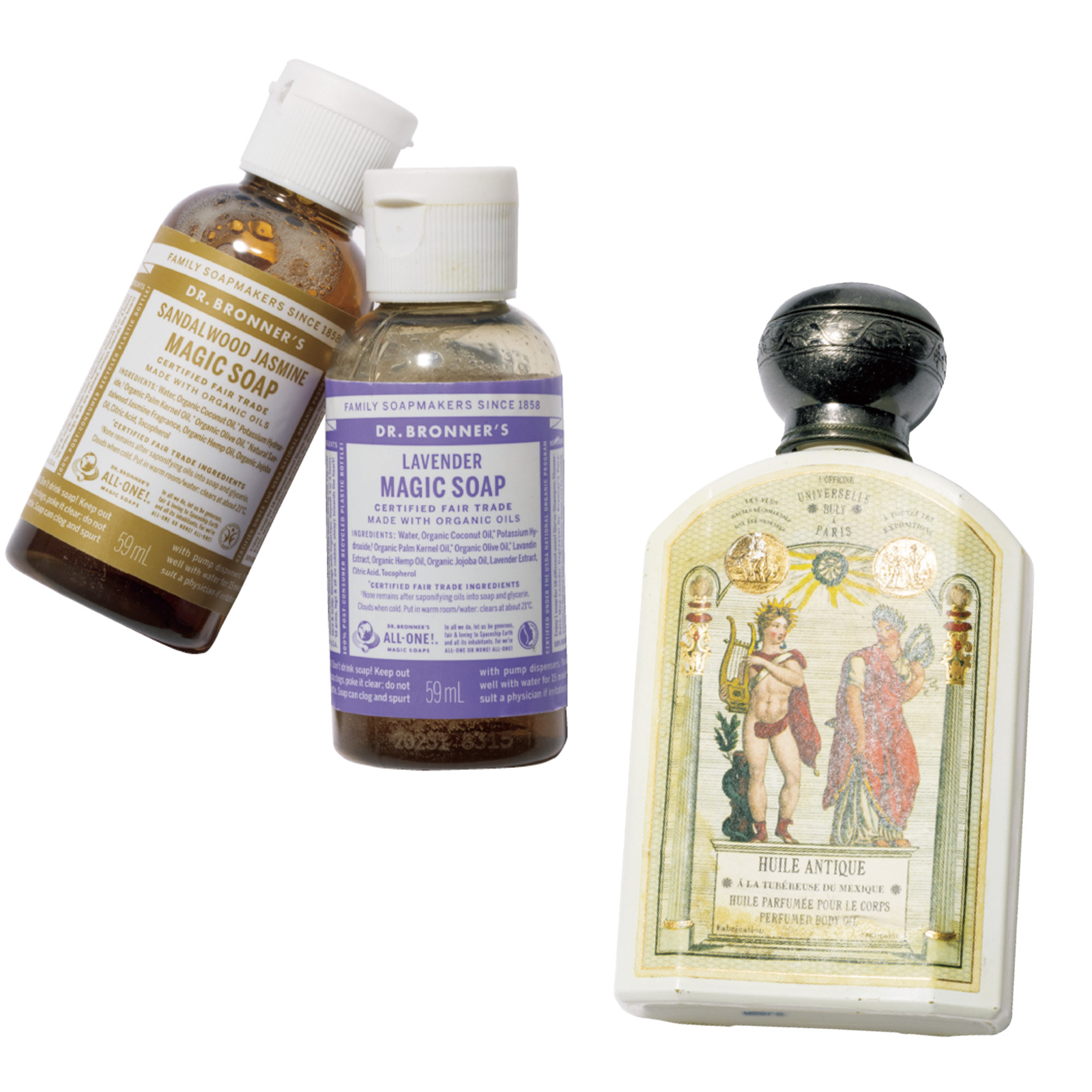 左/DR.BRONNER’Sのマジックソープはメイク落とし、ボディ洗いに、洗濯など12通りに使えます。その日の気分で香りをセレクト。