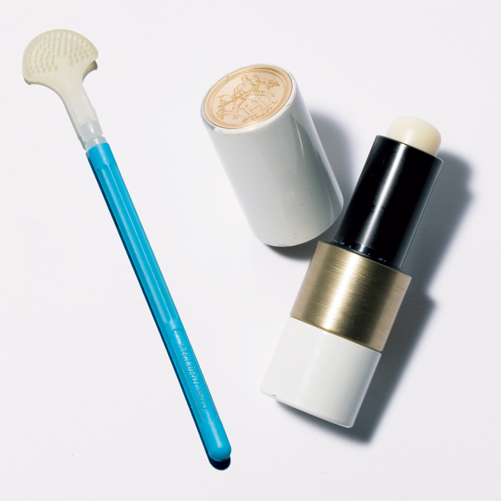 右/保湿効果の高いエルメスのリップバームは乾燥する機内にマスト。