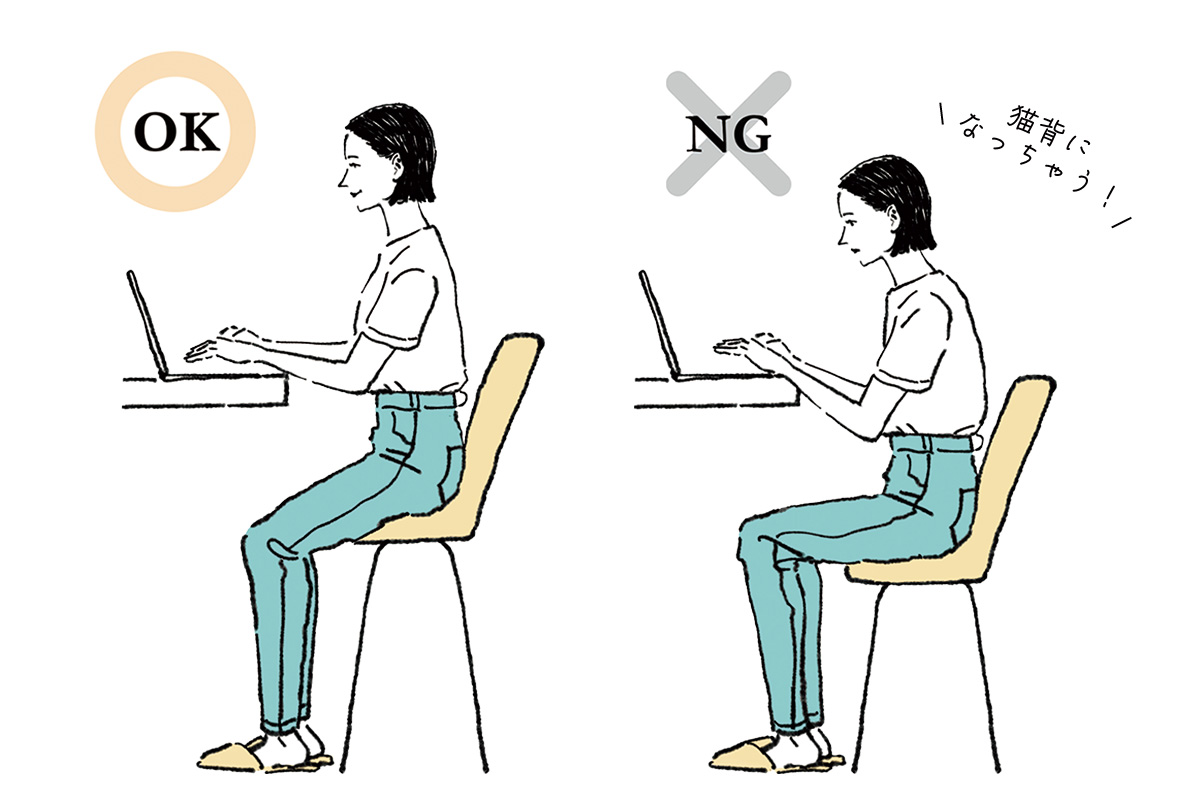 ひざより低い椅子でのデスクワークは猫背になり股関節の筋肉も硬くなり、太ももはもちろん、脚全体が太くなる原因に。1時間に1回歩いたり、スクワットするなど股関節を動かす意識も大切。