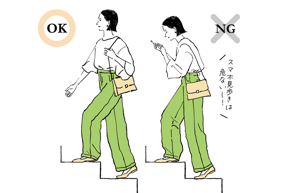下を向いて階段を上っていると、背中が丸まって骨盤が後傾になります。この状態で脚を持ち上げる動作を繰り返すと、前ももへの負担が大きくなり太くなる要因になるので気をつけましょう。