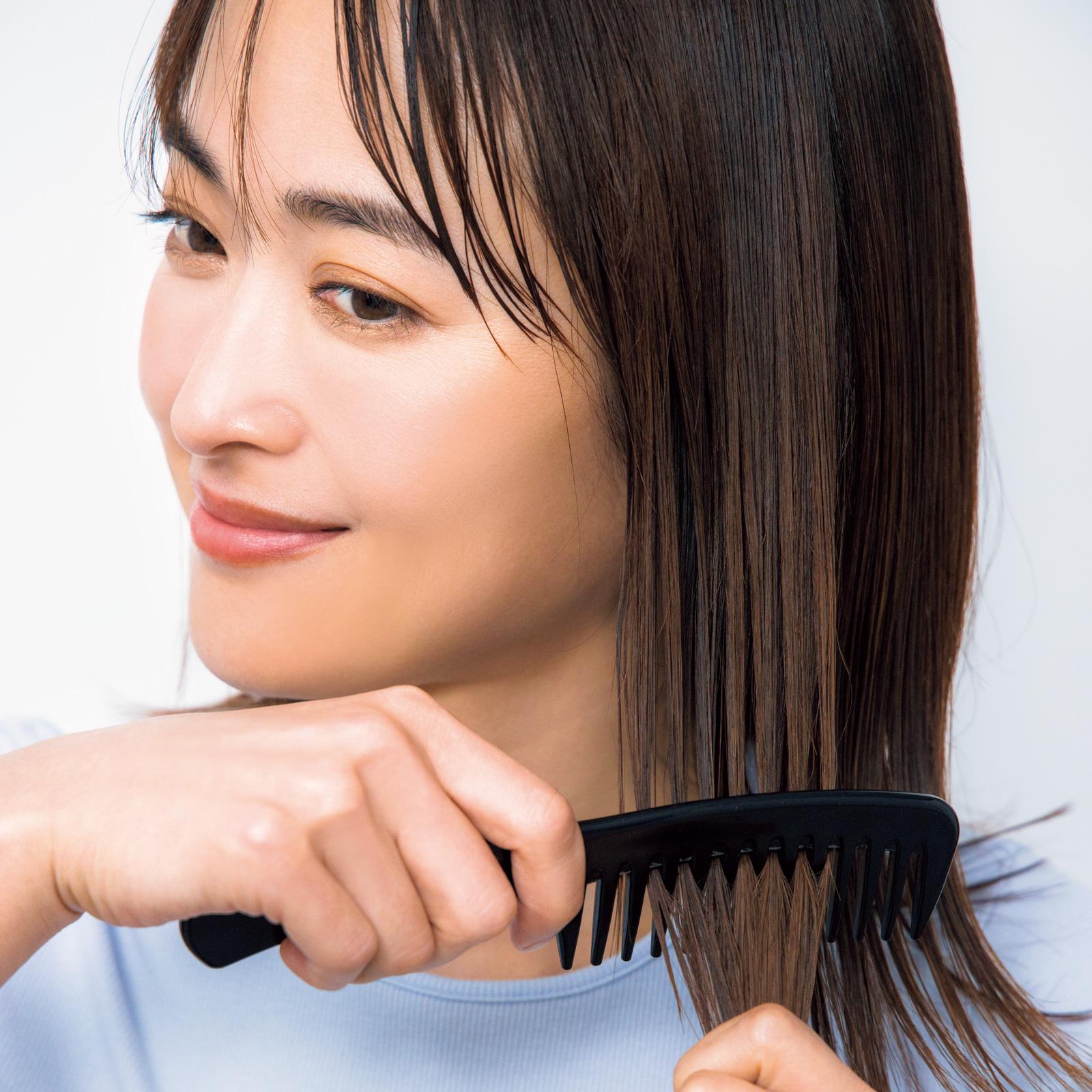 ②手でセラムをなじませた後、目の粗いコームでとかすと均一にセラムやミルクが髪に塗布でき、つけムラを防げます。