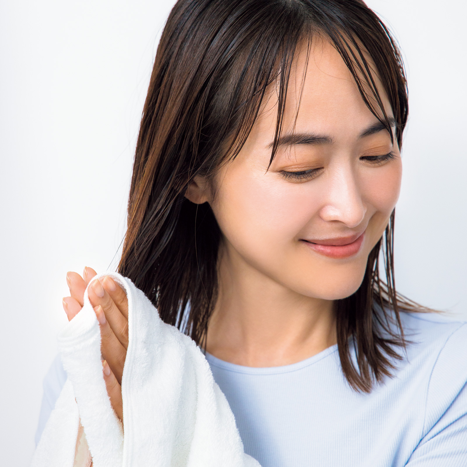①シャンプー後しっかりタオルドライをして水分をオフしてから、濡れた髪に手に取ったセラムをなじませます。