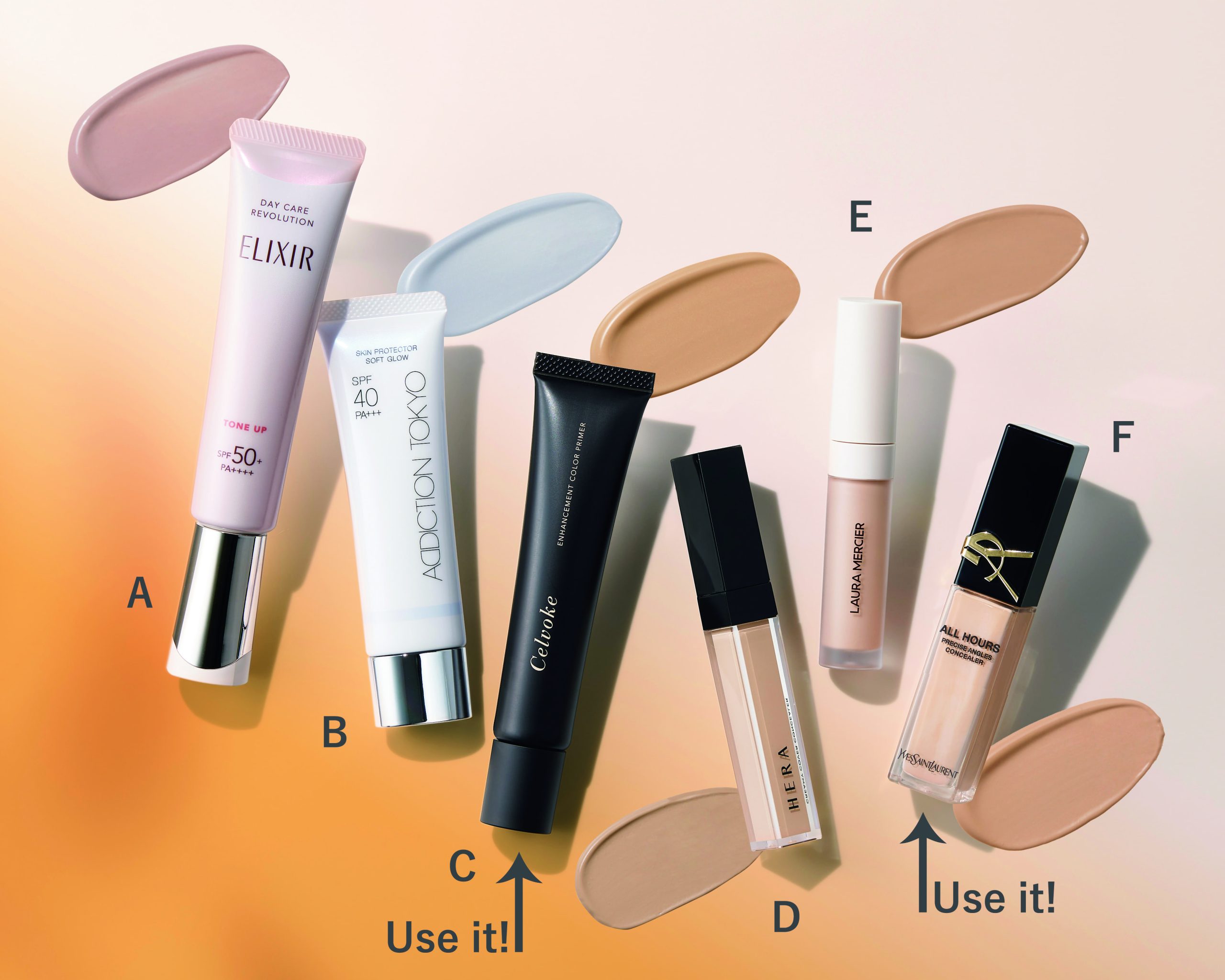 A:エイジングケアも。デーケアレボリューション トーンアップ SP+ aa SPF50+・PA++++ 35g ¥3,410(エリクシール)B:くすみに悩む肌に。アディクション スキンプロテクター ソフトグロウ Pure Blue SPF40・PA+++ 30g ¥4,180(ADDICTION BEAUTY)C:ナチュラルに肌補正し高保湿。エンハンスメント カラー プライマー 03 SPF43・PA+++ 30g ¥4,180(セルヴォーク)D:うるおいが長時間持続。クリーミー カバー コンシーラー 全3色 7.5g ¥4,510(HERA)E:軽やかな質感で悩みをカムフラ。ローラ メルシエ リアル フローレス ウェイトレス パーフェクティング コンシーラー 全6色 5.4ml ¥4,730(ローラ メルシエ ジャパン)F:カバー力も安心。オールアワーズ コンシーラー 全7色 15ml ¥5,940※LC1のみ8月2日発売(イヴ・サンローラン・ボーテ)
