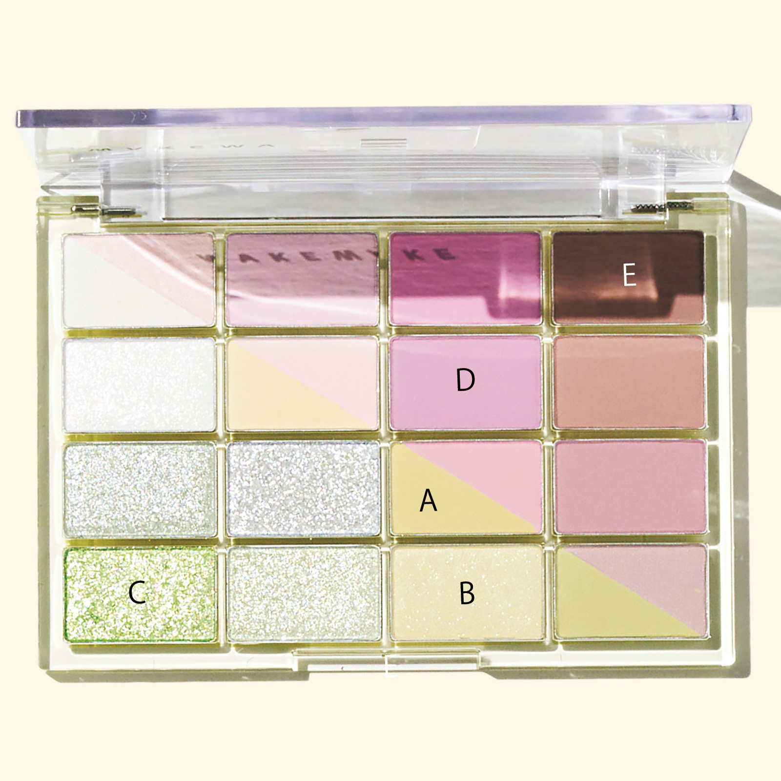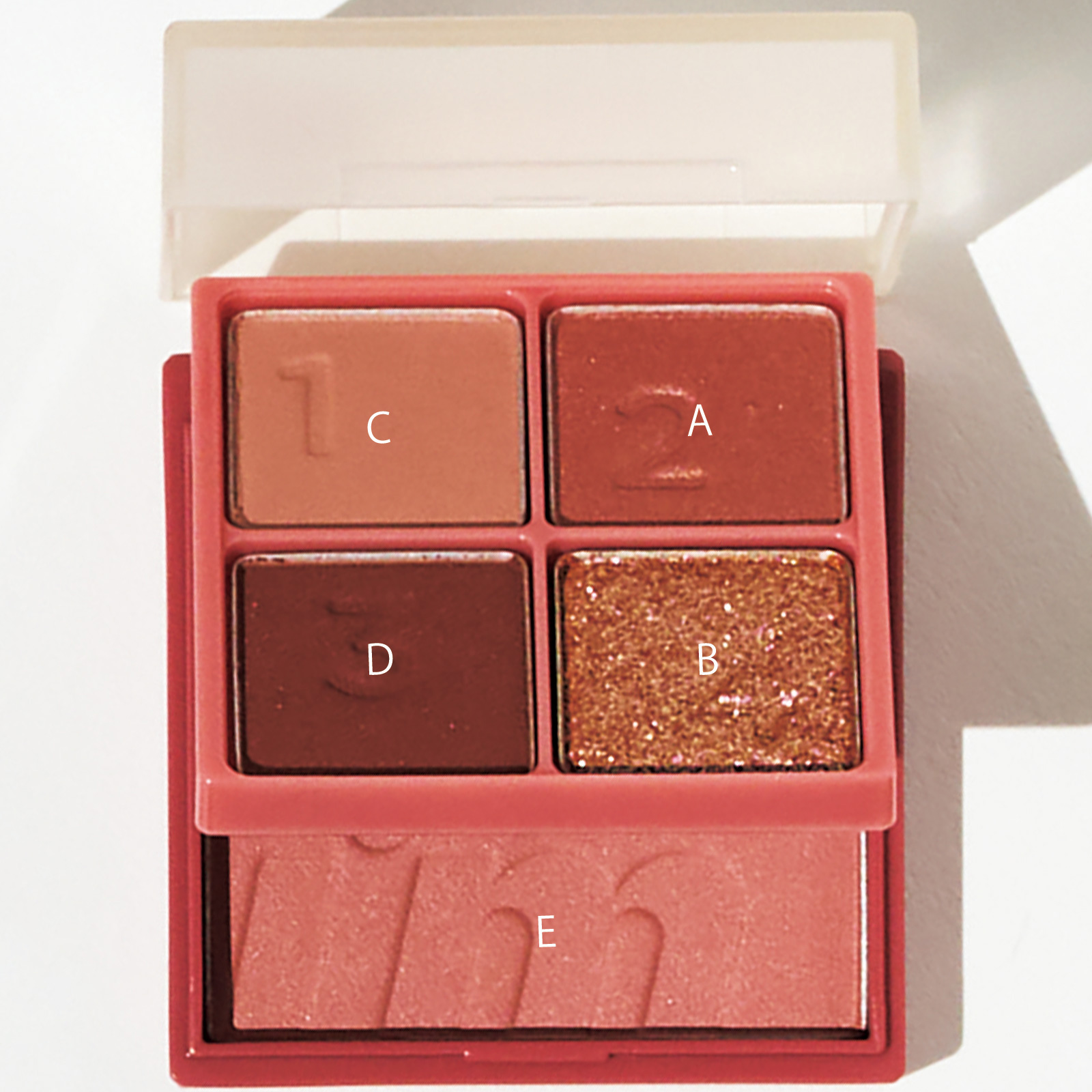 「Aをアイホール全体と目尻に入れ、くすみ払い。Bを二重幅に重ねてCを上まつ毛ギリギリに入れアイラインに。Dを下瞼の目頭から目尻まで太めに入れて、Eを目の下から頰に幅広にのせると、透明感を演出できます!」(平井)