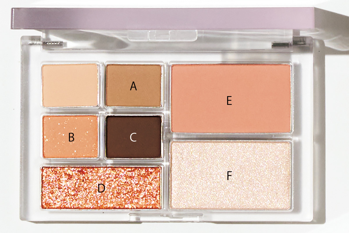 「AとBをアイホール全体にのせ血色感と陰影を作り、Cを目の際にラインとして引くと今っぽい!Dは黒目の上下にポイントで。Eのチークはブラシでふんわりのせ、ハイライトのFは鼻先や鼻の付け根に」(ヘア・メイクアップアーティスト 小澤 桜さん)