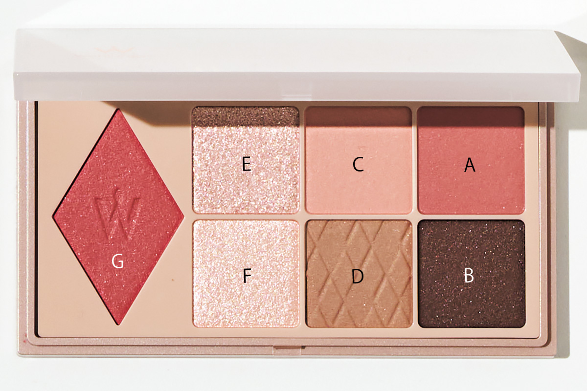 「Cを瞼全体にのせ、Dを二重の内側に。Bをアイラインで引いて、Aを目元のCゾーンにふんわりのせる。Eを瞼の中央、Fを目頭にのせると華やかに!Gはチークに、Cは顎下にピンクシェーディングとしても活用しています」(西岡)
