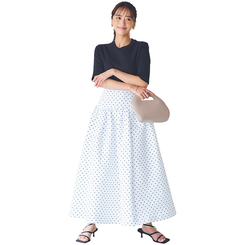 シンプルな黒Tシャツでも、ボトムスにボリュームのある白のフレアスカートを合わせれば涼やかさがグッとアップ。控えめドットのスカートならシンプルになりすぎず、甘さも演出可能!