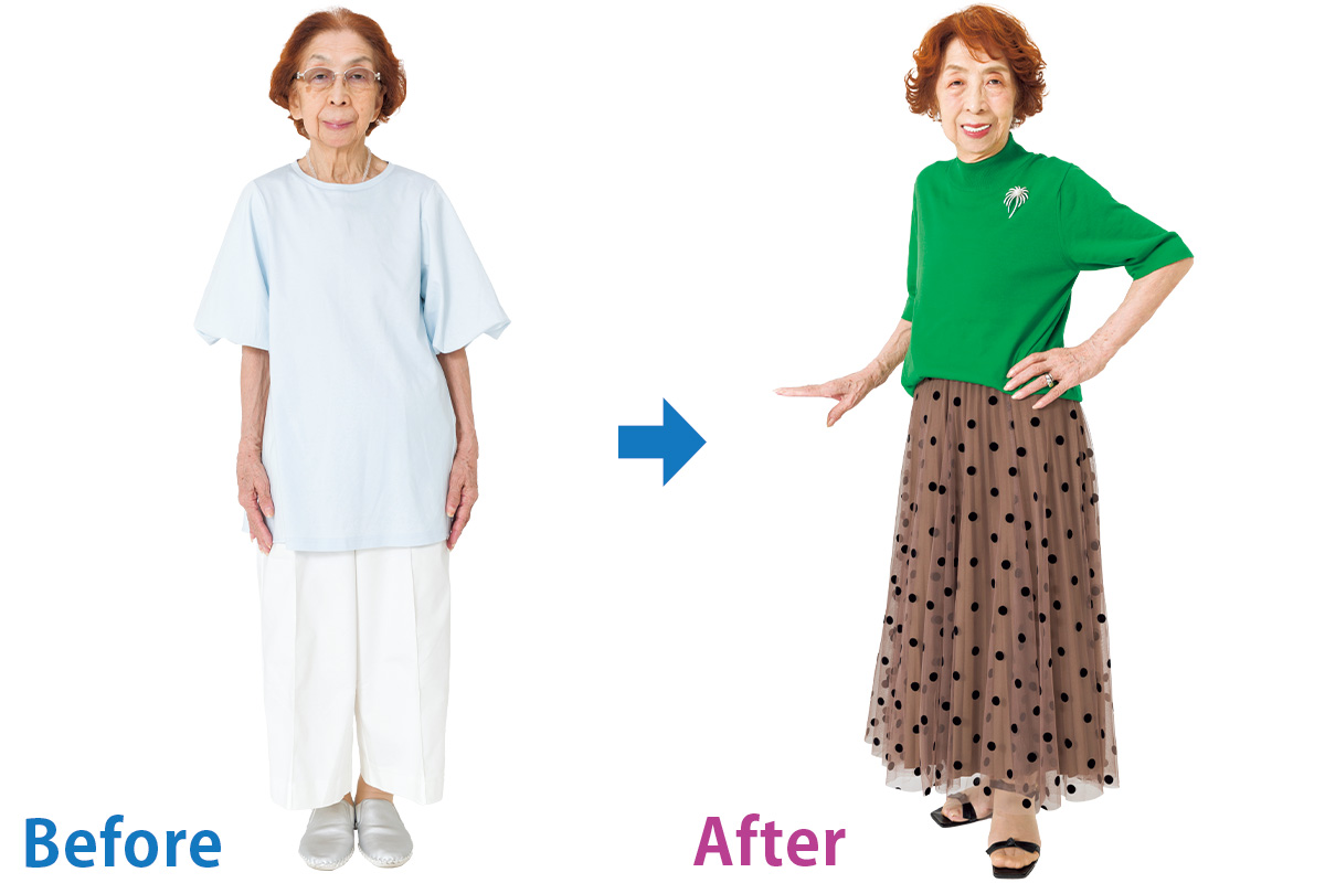 「父を亡くしてからしょんぼりしていた母が元気を取り戻しました。初めての色みのニットでおしゃれ意欲も復活」(娘・奈都子さん)「姿勢も全然違いましたね」(娘の夫・弘行さん)