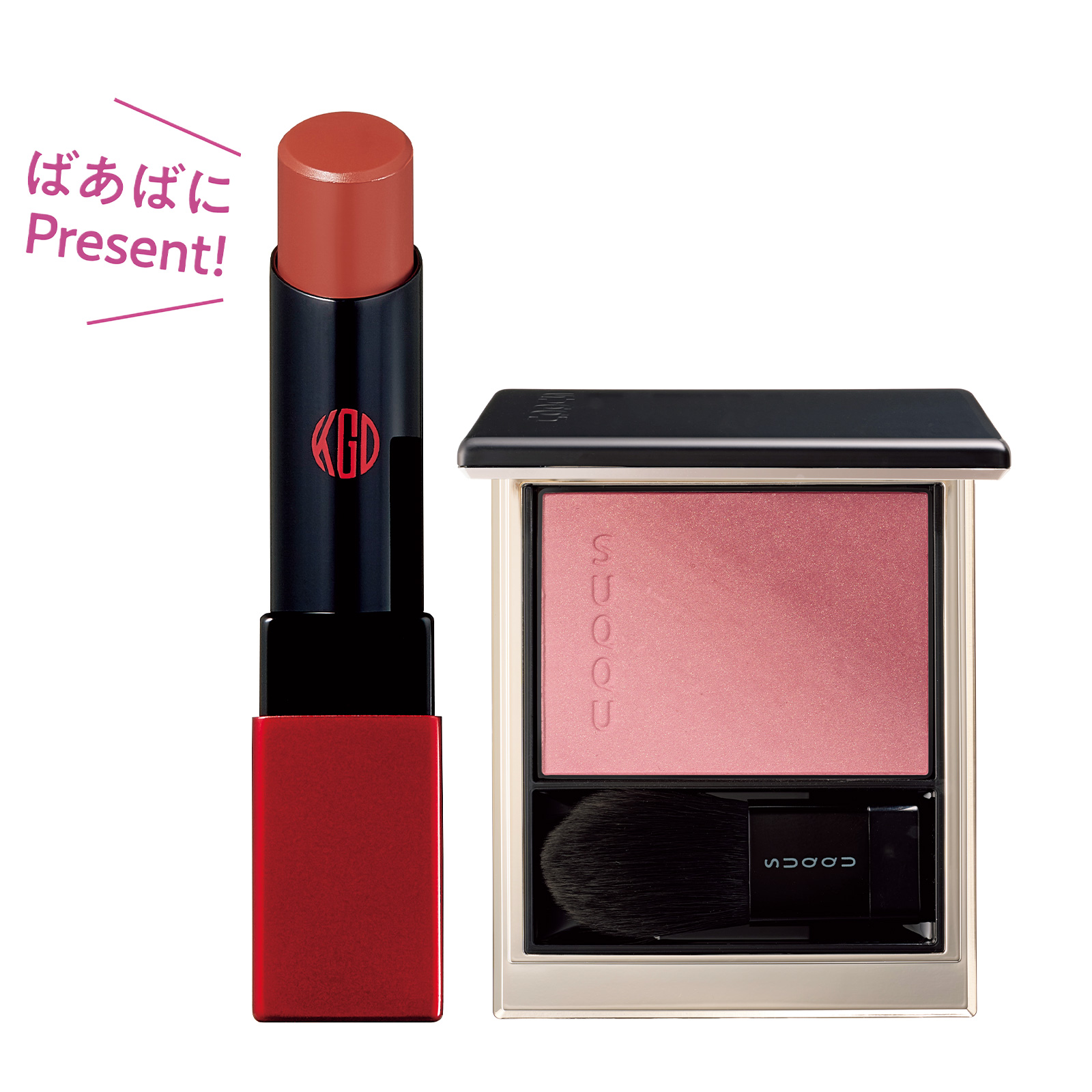 左から:スティックルージュ グロッシー カラーバーム01 ¥3,300(Koh Gen Do)SUQQU ブラーリング カラー ブラッシュ 04¥6,600(SUQQU)