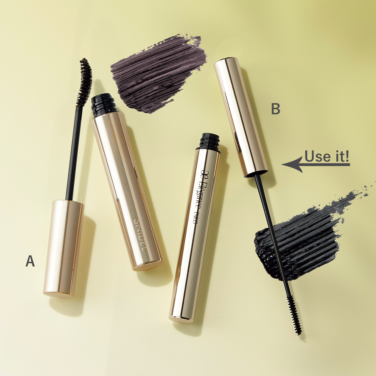 A:まつ毛を強固にカールロック。カール ロック マスカラ 01 ¥3,300(SNIDEL BEAUTY)B:全方位で美しい上向きまつ毛を一日中キープ。エレガンス カールアメージングマスカラ BK10 ¥4,400(エレガンス コスメティックス)