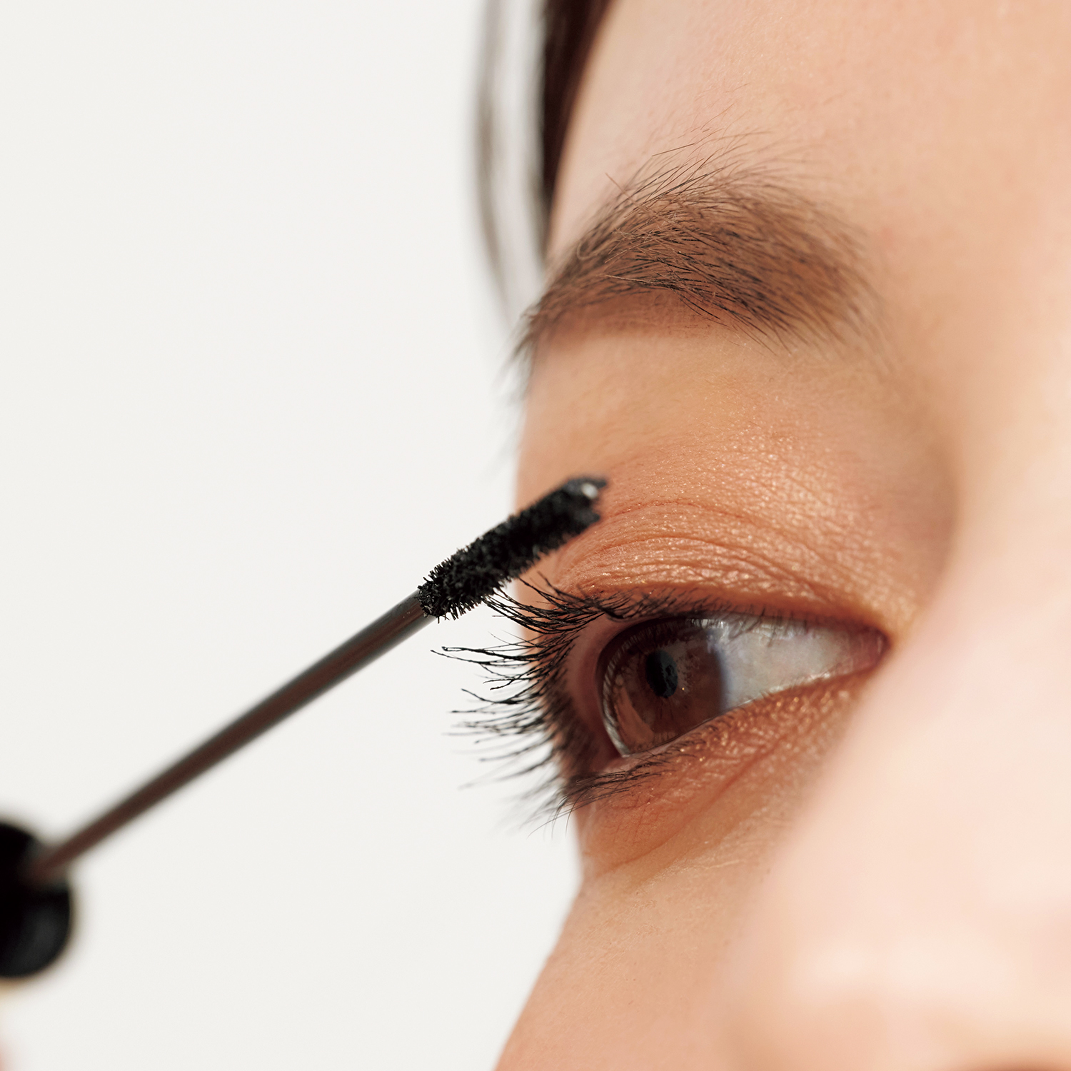 まつ毛はカールアップしているだけでも華やいだ印象に。マスカラを塗りすぎると色落ちも心配。根元に色をのせすぎず、毛先まで流す程度に。