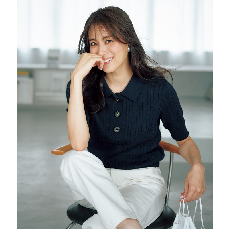 デニムパンツ¥27,500(アッパーハイツ/ゲストリスト)ポロニット¥42,900(エイトン/エイトン青山)ベルト¥22,000(A VACATION/ノーベルバ)ピアス¥28,600(マリハ)バッグ¥52,800(VASIC/ヴァジックジャパン)