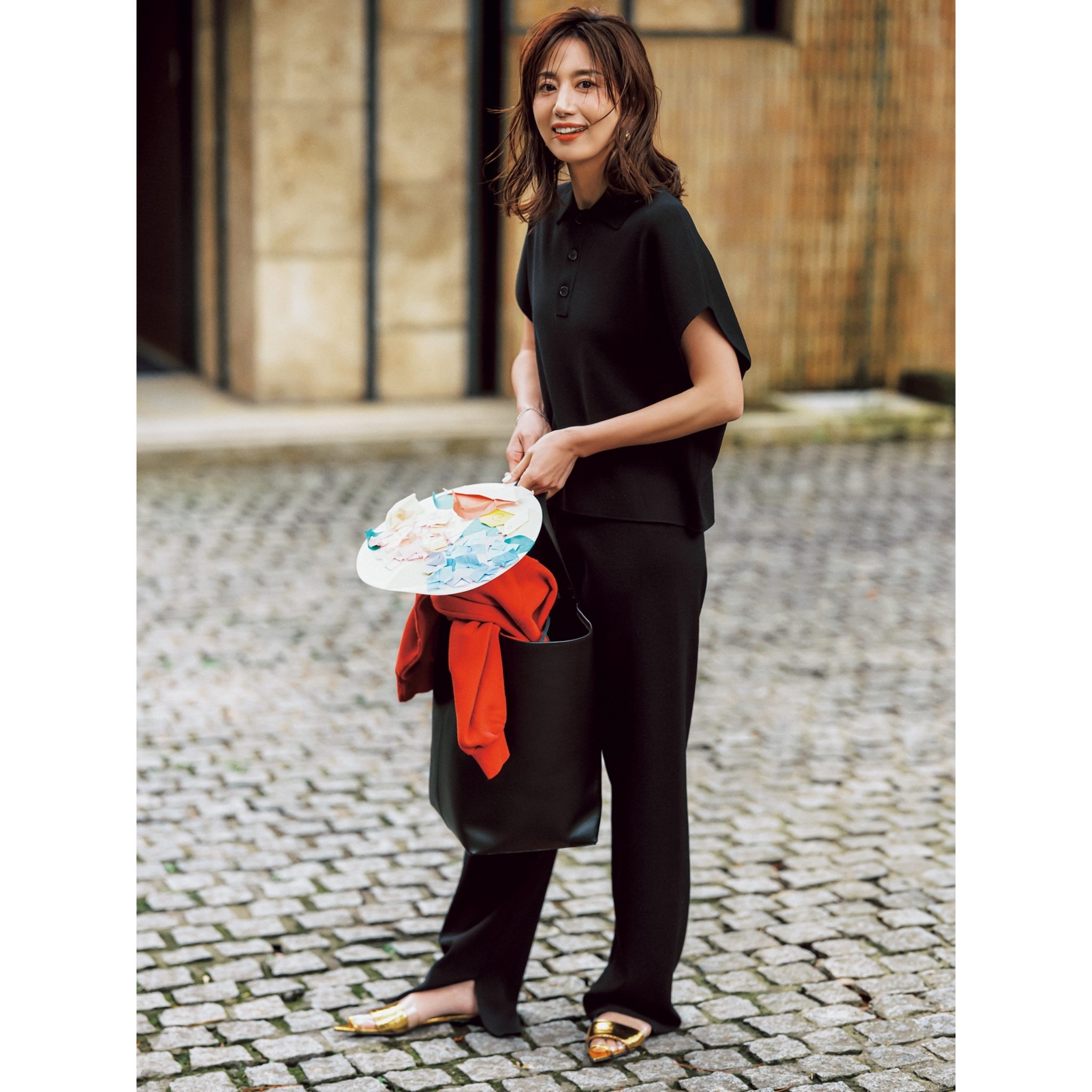 ニット¥30,800(スローン)パンツ¥30,800(グラフペーパー/グラフペーパー東京)バッグ¥40,700(ヴァジック/ヴァジックジャパン)シューズ¥39,600(ファビオ ルスコーニ/ファビオルスコーニ ルミネ有楽町店)ピアス¥37,400(プラウ)
