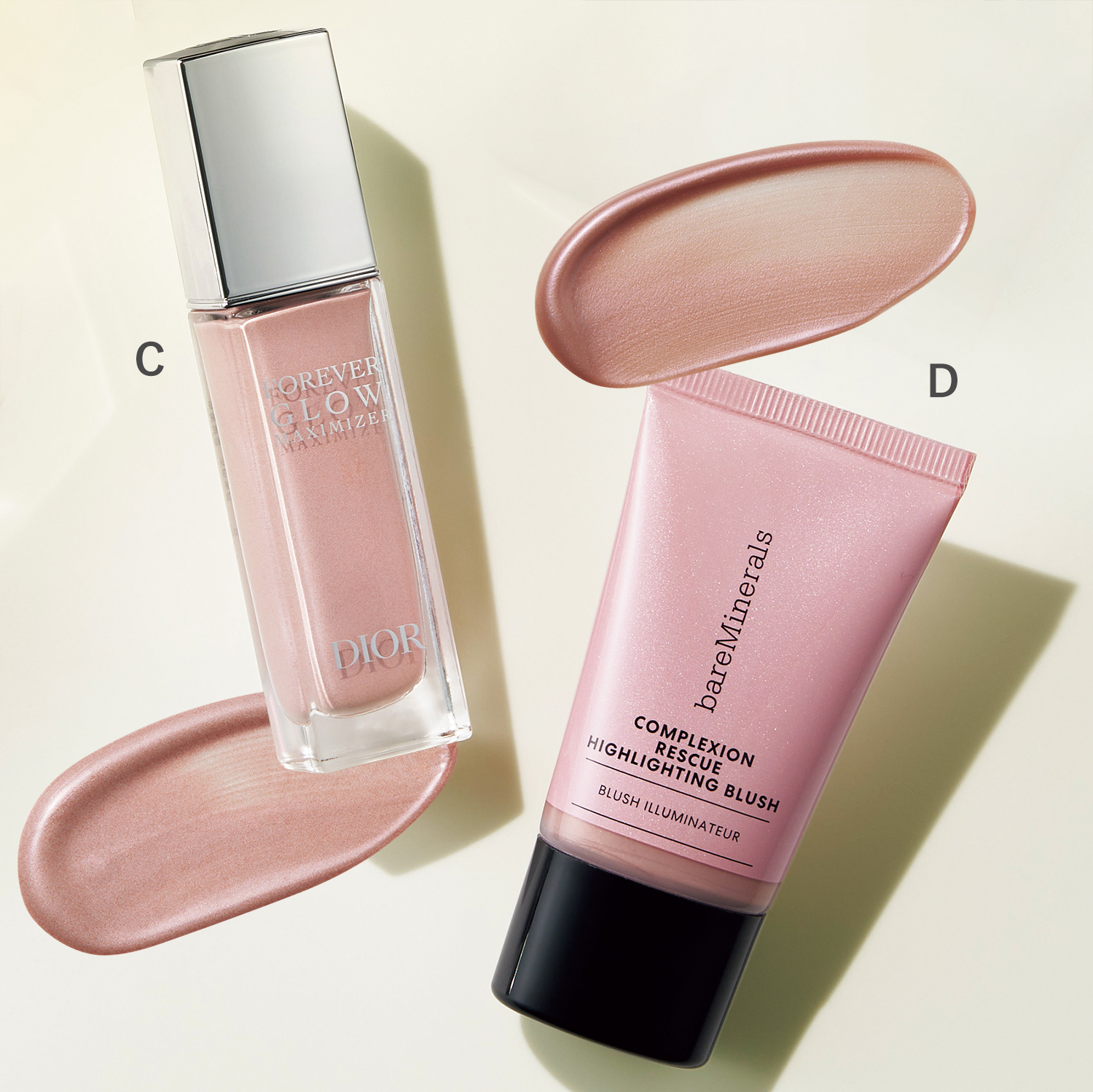 C:血色もハリも。ディオールスキン フォーエヴァー グロウ マキシマイザー ピンク ¥5,940(パルファム・クリスチャン・ディオール)D:重ねても軽やか。CR ハイライター ローズ グロー ¥3,960(ベアミネラル)