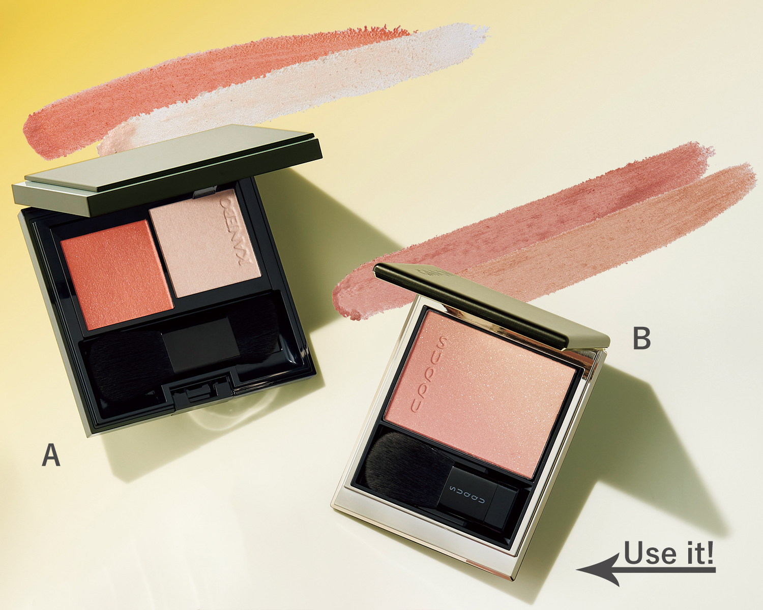 A:キュートな印象に。カネボウ ムードブースティングブラッシュ 02 ¥5,830※セット価格<7月26日発売>(カネボウインターナショナルDiv.)B:濃淡2色で立体感UP。ブラーリング カラー ブラッシュ 03 ¥6,600<7月19日発売>(SUQQU)