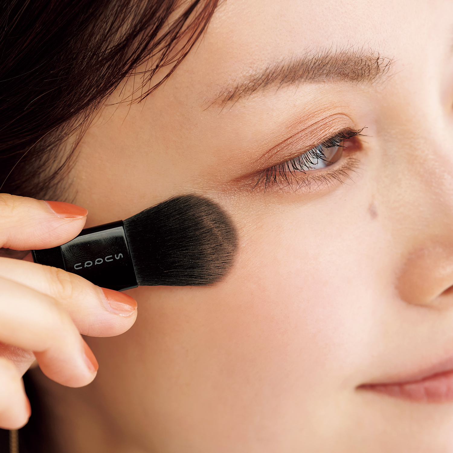パウダーチークの血色カラーを鼻横から横に広げたら、ハイライトカラーを上部に重ねます。黒目の下からこめかみに抜けるように、いつもより広めに塗ります。