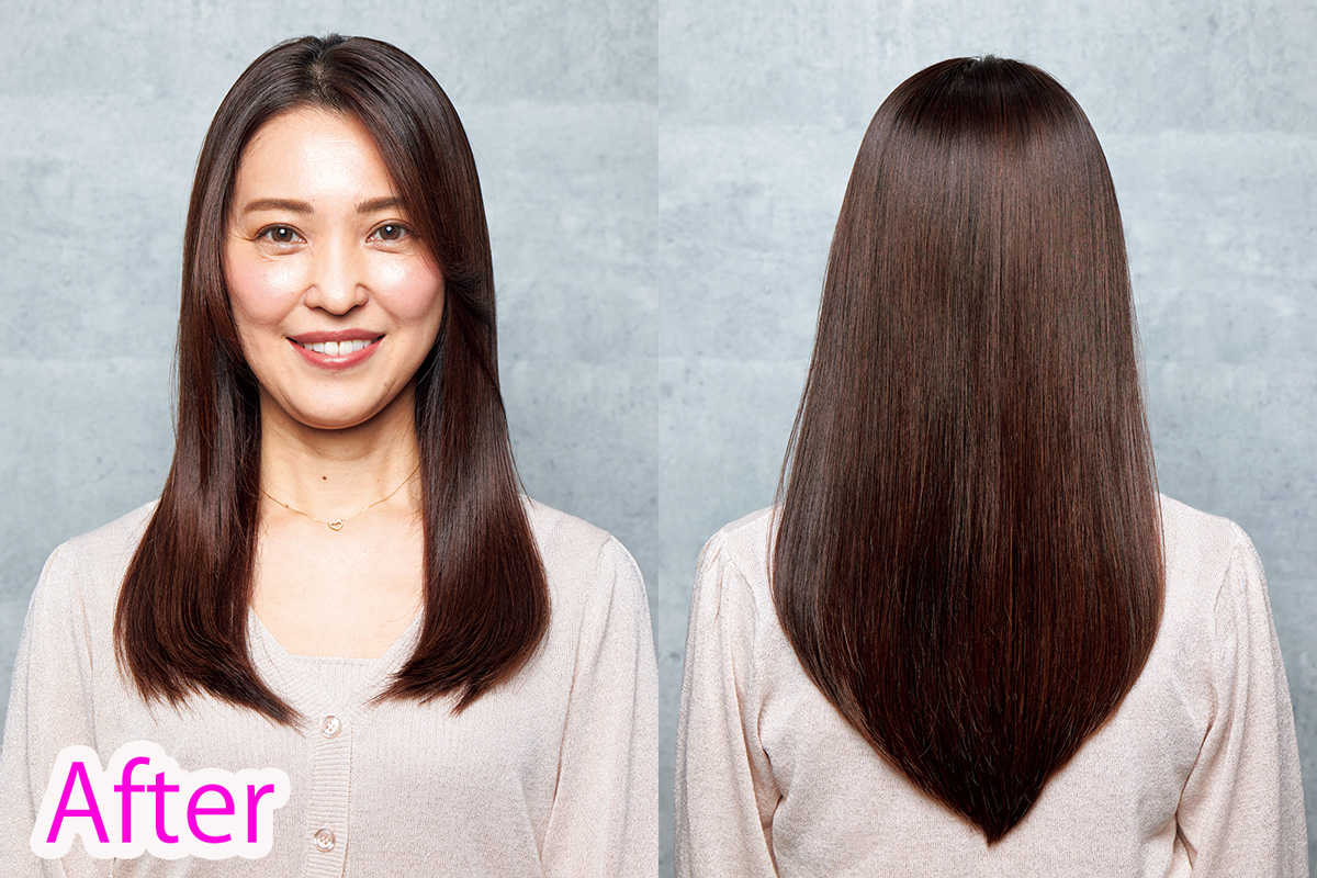 施術直後、仕上がりのしっとりした手触りに感激したという石坂さん。細いのにごわついて硬かったパサパサ髪が久しぶりに手に吸いつくようななめらかさに。後ろ姿がまるで自分ではないような仕上がりに大満足。同メーカーには大人気のホームキットもあるそうなので「ホームケアもぜひトライしてみたいです」。