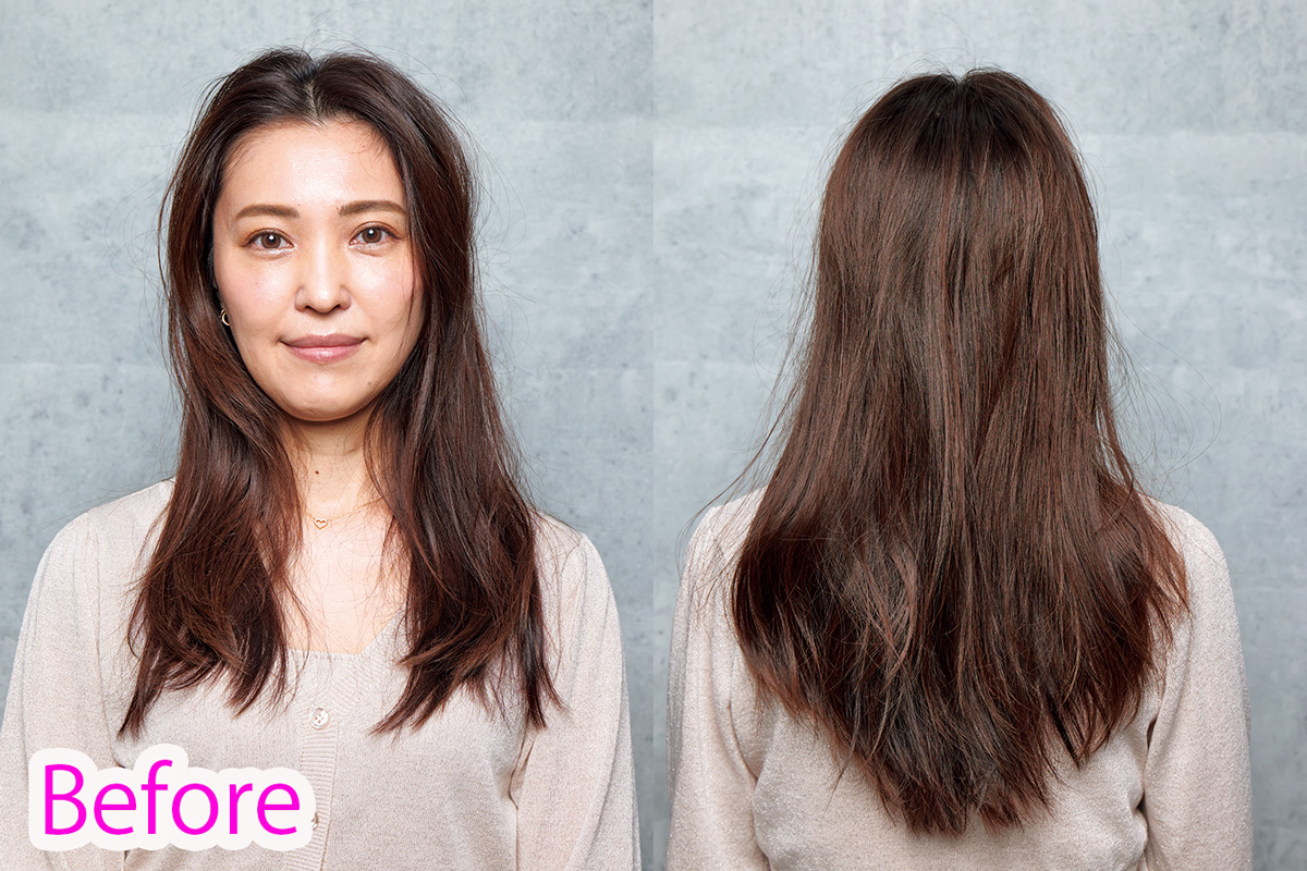 細くて絡まりやすい毛質が悩み。40歳を過ぎた頃からコシがなくなって分け目が目立つように。カラーもあっという間に色が抜けていくので「月1の染め直しが必須なんです」。