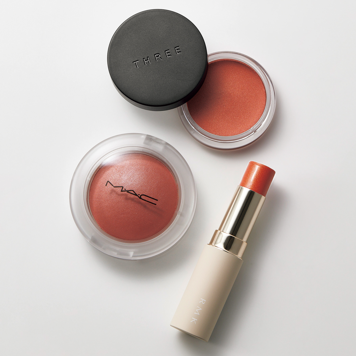 上から:リキッドファンデとも相性抜群。肌の上でほわりとした質感に。THREE グラムトーンカラーカスタード 04 ¥3,300(THREE)さらっ とした質感でお粉の上にも。グロー プレイ クッショニー ブラッシュ ブラッシュ,プリーズ ¥4,950(M・A・C)上品なツヤで色っぽく。RMK カラースティック 05 ¥3,300(RMK Division)